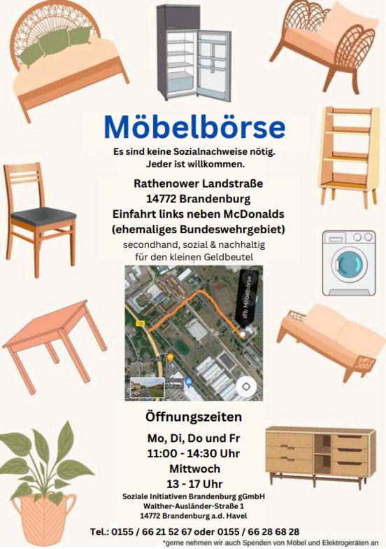 Die Möbelbörse der Sozialen Initiativen Brandenburg gGmbH bietet eine breite Auswahl an gebrauchten Möbeln, welche perfekt für den kleinen Geldbeutel sind. Das Sortiment beinhaltet komplette Schlafzimmer, Wohnzimmer, Küchen, Flurgarderoben, Badmöbel sowie Elektrogeräte. Es gibt aber auch Bilder, Vasen, Kinderspielzeug und andere Kleinteile.