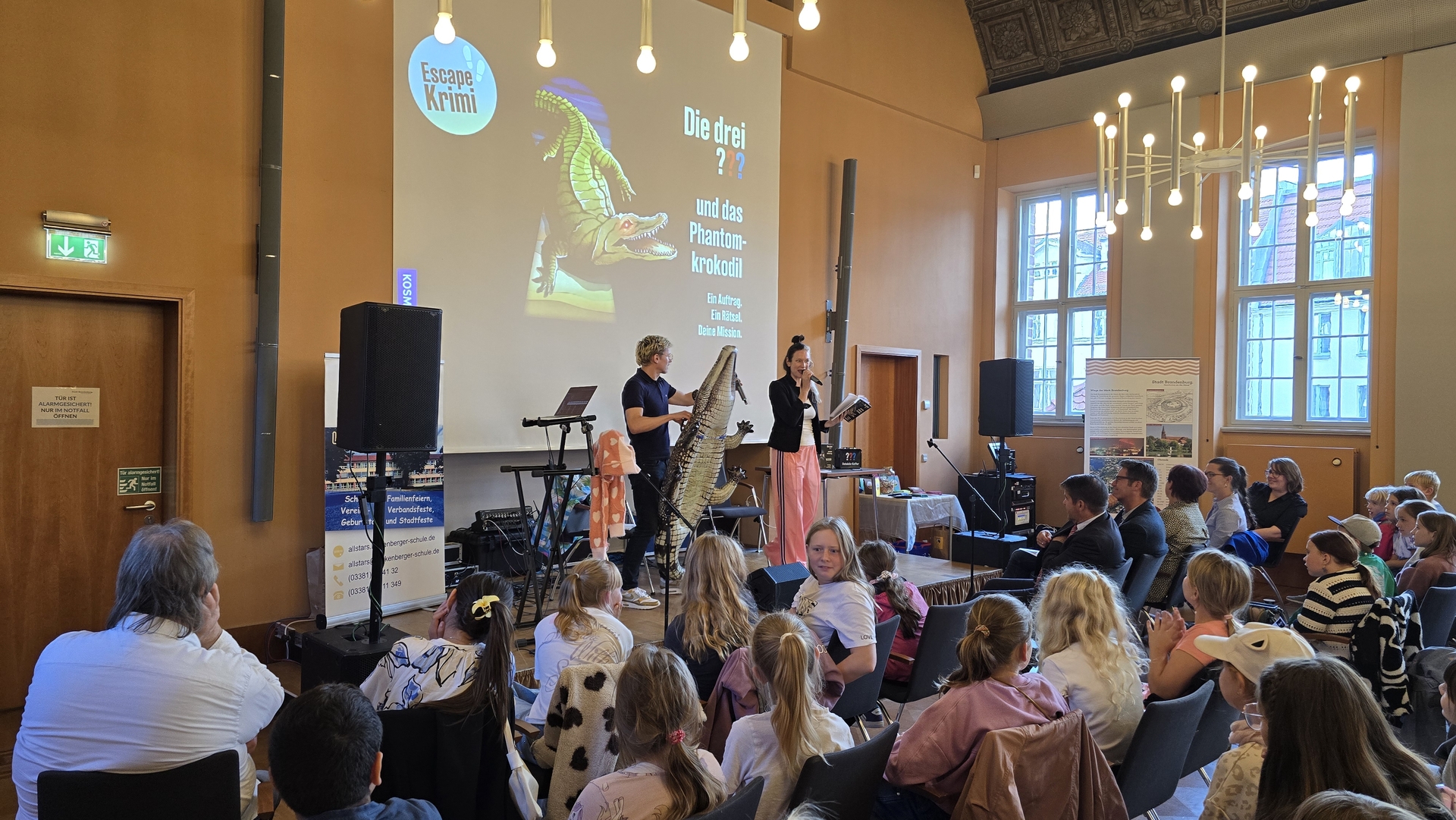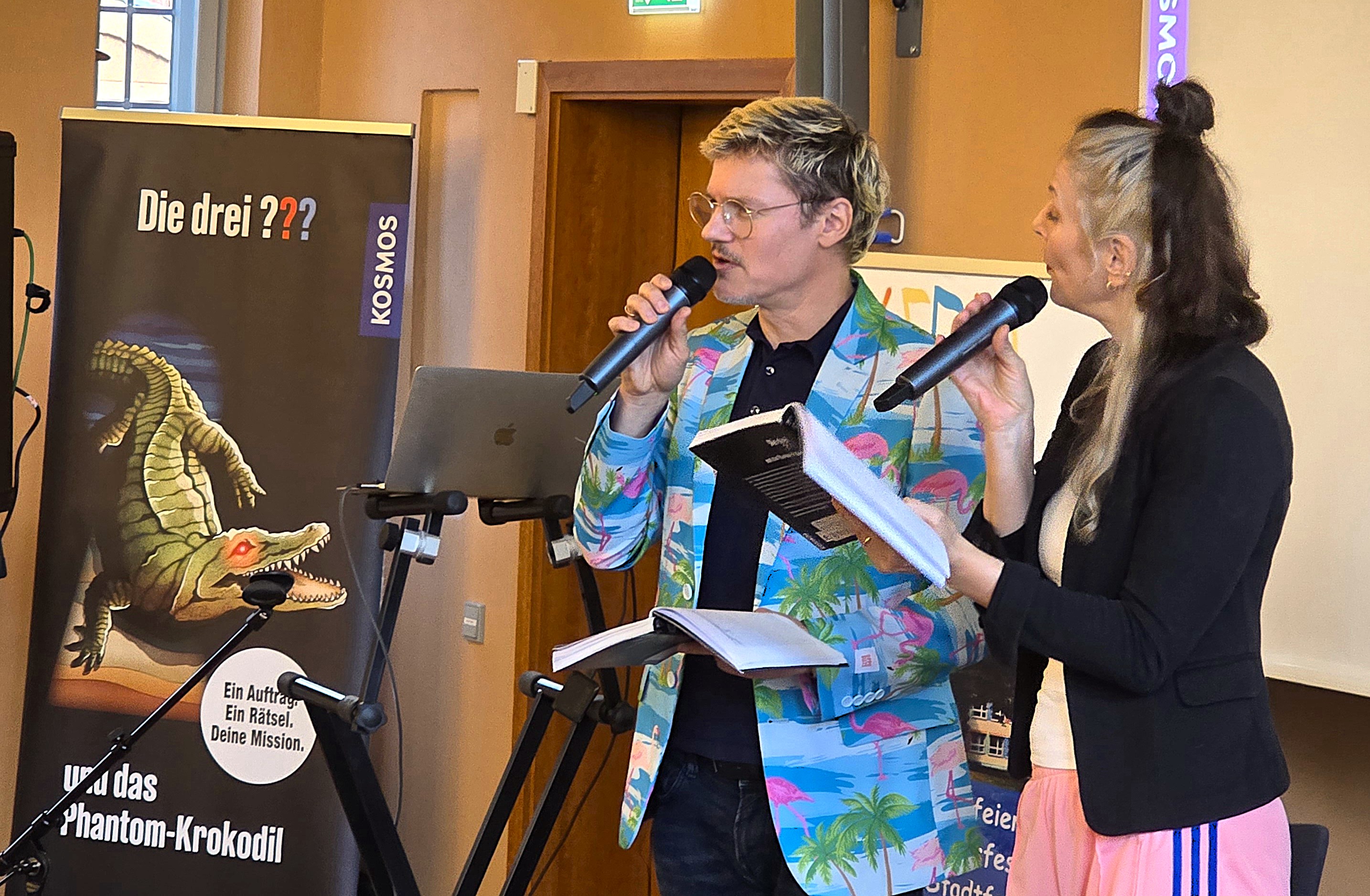erzählte er der Gästeschar und verriet ihr, ein großer Krimifan zu sein. Da passte es doch prima, dass zwei Autoren der Kinderbuchreihe „Die drei ???“ mit einer äußerst lebendigen Lesung ihr „Phantomkrokodil“ vorstellten. Cally Stronk und Christian Friedrich machten die Kinder mit Fragen, Rätseln und Zetteln zu Mitgestaltern im Krimigeschehen und huschten dabei oft durch den großen Saal, um das ganze Publikum mitzunehmen. Nach einer Stunde gab es tosenden Beifall, viele Autogramme – und natürlich die Teilnehmerurkunden für die Lesesommer-Kinder. Unter ihnen wurden zudem einige Preise wie die mit City-Gutscheinen und Kleinigkeiten gefüllten Bibliotheks-Rucksäcke verlost. Und zu guter Letzt gab es noch die hauseigenen 3-Druck-Pokale für die fleißigsten Leserinnen und Leser: Bei den Teilnehmenden der 2. und 3. Klassen lagen Janick Blach und Moritz Roos mit jeweils neun Büchern vorn, bei den 4.- und 5.-Klässlern Rafael Grigoriants mit 26 Büchern. In der Alterskategorie ab Klasse 6 war Anton Lorek mit 50 gelesenen Büchern absoluter Spitzenreiter.