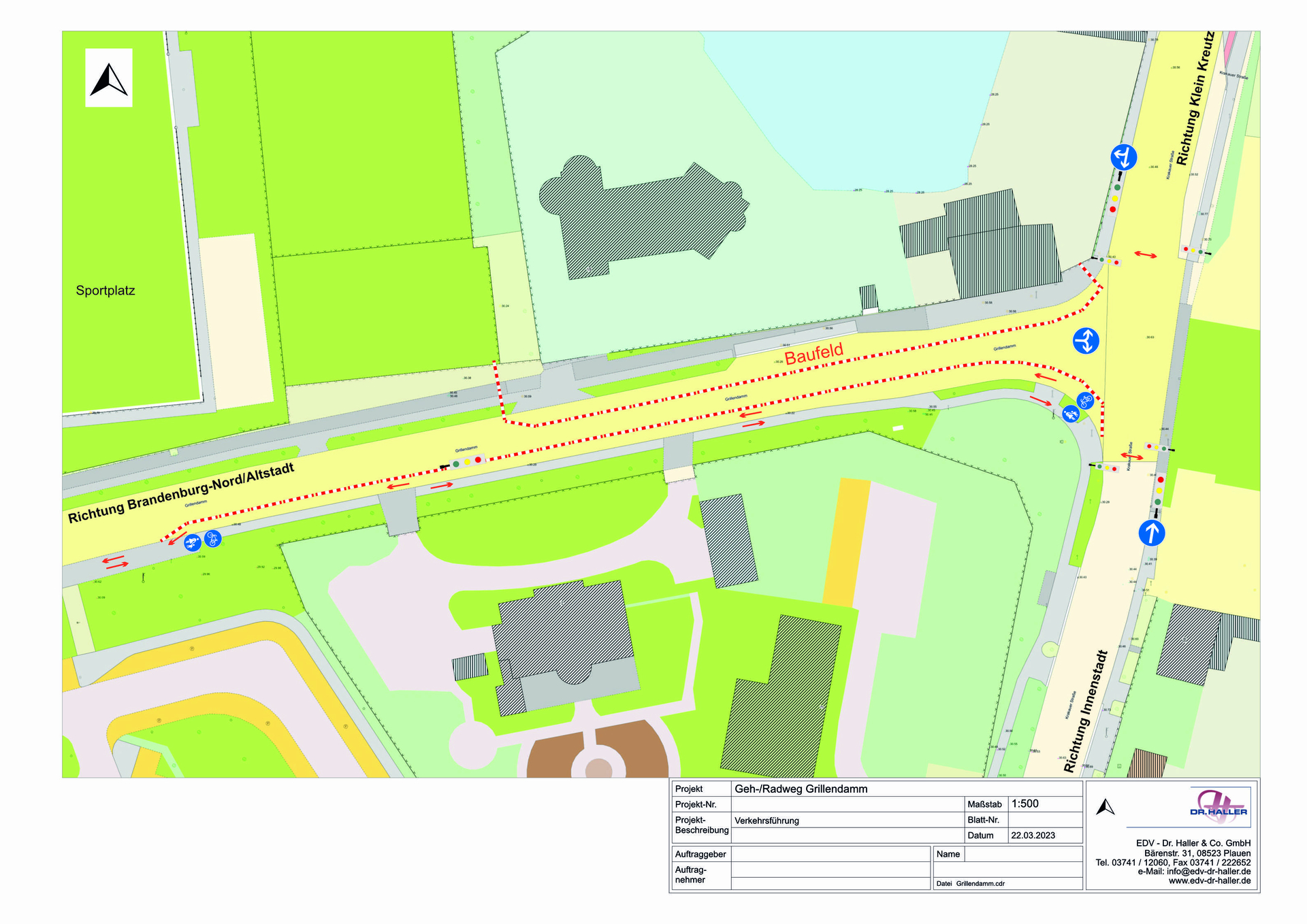 Die reguläre Lichtzeichenanlage am Knoten Krakauer Str./ Grillendamm wird für die Zeit der Baumaßnahme durch eine gesonderte Baustellenampel ersetzt. Für die Zeit der Bauausführung ist es zudem zur Entlastung der Verkehrssituation untersagt, aus der Krakauer Straße nach links in den Grillendamm abzubiegen.