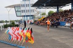Danach erfolgten der Einmarsch der Fahnenträger der einzelnen Landesverbände und ein abwechslungsreiches artistisch-musikalisches Showprogramm, das beim Publikum offensichtlich sehr gut ankam, denn viele junge Sportlerinnen und Sportler reihten sich in die spontan gebildete Polonaise ein. Es folgten Grußworte von Oberbürgermeister Steffen Scheller und Hans-Walter Humme, der beim Deutschen Kanu-Verband e.V. das Ressort Kanu-Rennsport leitet.