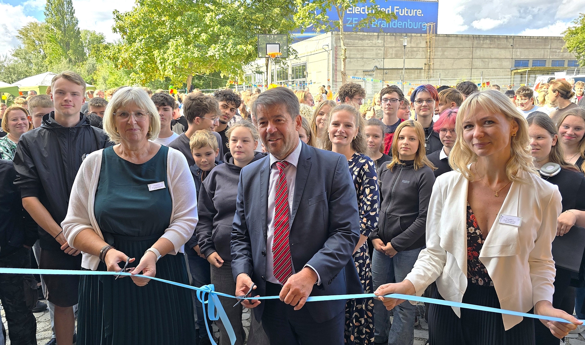 305 Schülerinnen und Schüler bevölkern gegenwärtig den Komplex, der seit dem 13. Mai 2025 den Namen Hildegard-von-Bingen-Oberschule tragen darf. Das wurde zum ersten Schulfest über dem Eingang bunt zur Schau gestellt und stand sodann auch im Mittelpunkt, als Schulleiterin Kathrin Kazmierczak, Stellvertreterin Julia Frederich und Oberbürgermeister Steffen Scheller per Banddurchschneiden die offizielle Freigabe des neuen Schulgebäudes und die feierliche Bekanntgabe des neuen Schulnamens zelebrierten.