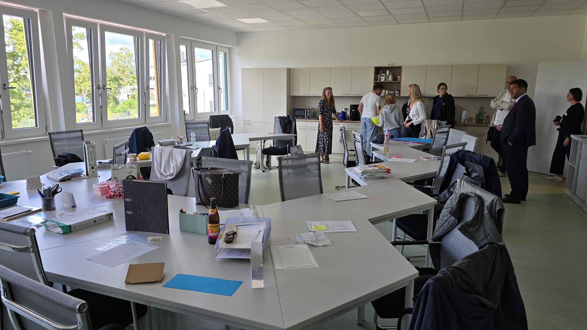 Der Umzug war großteils schon während der Sommerferien bewältigt worden, wie auch die Herrichtung der Außenanlagen, die in dem Sommer-Investitionspaket von 1,04 Millionen Euro enthalten sind. Dafür wurde der etwa 2000 Quadratmeter große Hofbereich mit Betonpflaster befestigt und mit Pflanzflächen, Bankrondellen, Hochbeeten, Tischtennisplatten, Bolzplatztoren und einer Streetballanlage ausstaffiert. Außerdem wurden jede Menge Fahrradbügel aufgestellt, Abfallbehälter platziert und Sträucher gepflanzt. Die Bäume folgen im Herbst.