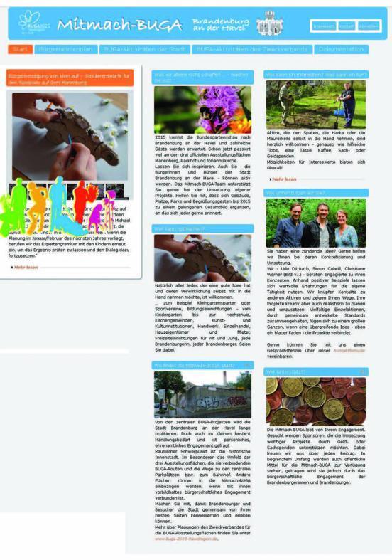 "Mit der neuen Webseite www.mitmach-buga-brandenburg.de informiert die Stadtverwaltung ab sofort aktuell über die Mitmach-BUGA und die Investitionen der Stadt Brandenburg an der Havel im Rahmen der Bundesgartenschau 2015 Havelregion", so der Beigeordnete Michael Brandt.