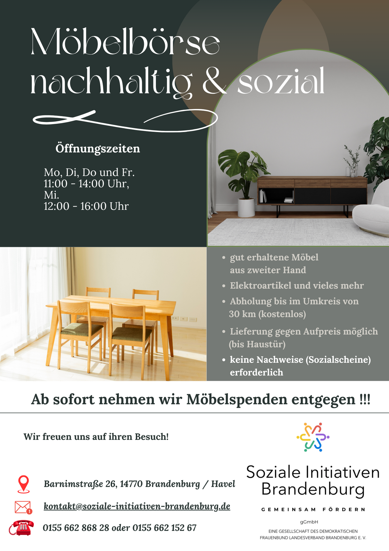 Die Möbelbörse der Sozialen Initiativen Brandenburg gGmbH bietet eine breite Auswahl an gebrauchten Möbeln, welche perfekt für den kleinen Geldbeutel sind. Das Sortiment beinhaltet komplette Schlafzimmer, Wohnzimmer, Küchen, Flurgarderoben, Badmöbel sowie Elektrogeräte. Es gibt aber auch Bilder, Vasen, Kinderspielzeug und andere Kleinteile.
