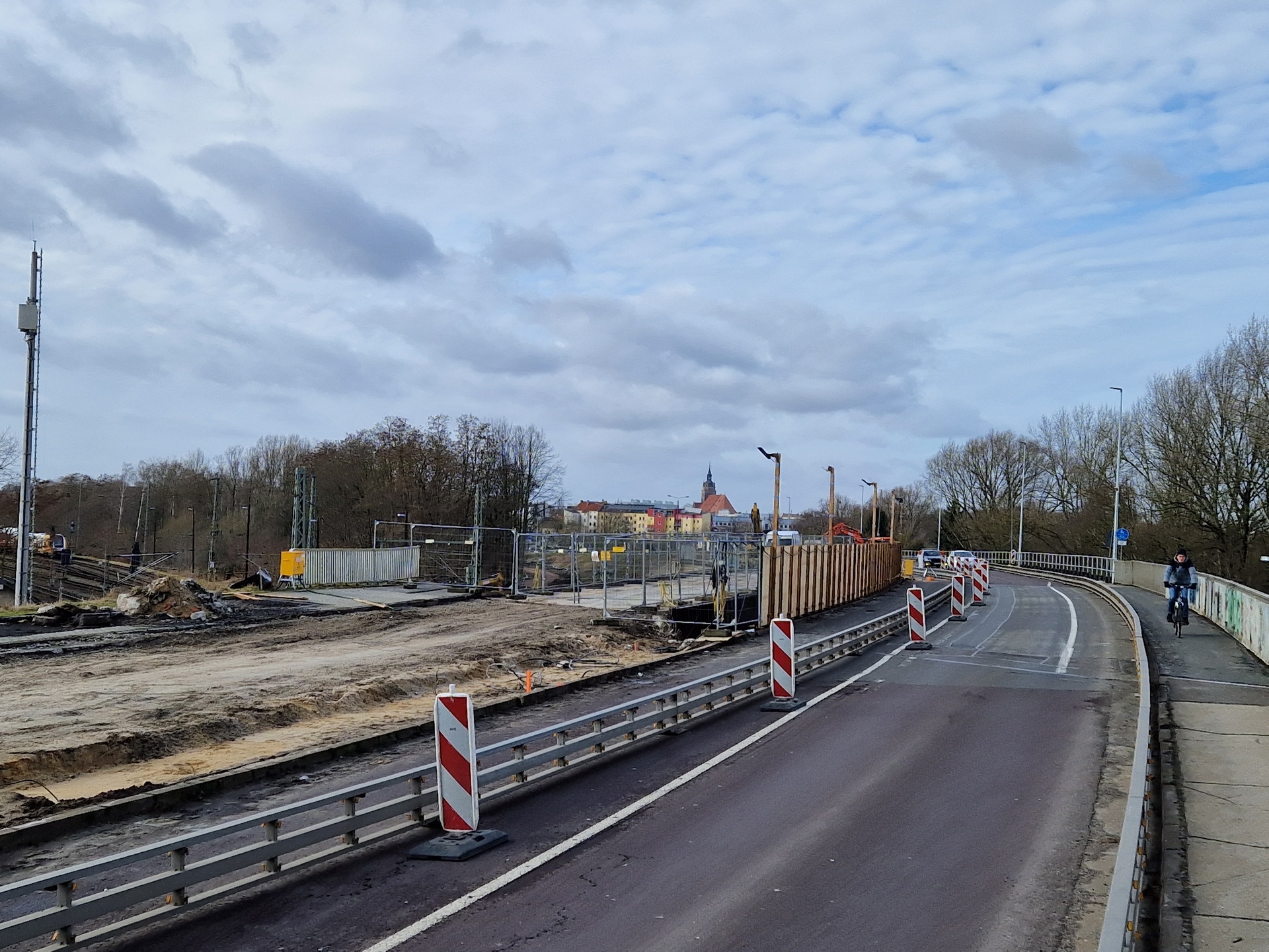 Die Baustelle in der Potsdamer Straße hatte sich kurzfristig ergeben, weil der Landesbetrieb Straßenwesen die beiden Teile der Brücke über die Gleise der Deutschen Bahn AG im Zuge der Bundesstraßen B1/B102 aus Sicherheitsgründen überprüfen ließ. Dabei wurde festgestellt, dass die Gründung für das derzeit befahrene Bestandsbauwerk in einem deutlich schlechteren Zustand ist, als erwartet. Umfangreiche Stützmaßnahmen sind notwendig, um ein Abkippen der verbleibenden Brückenlager zu verhindern, während die benachbarte Brücke samt Lager abgerissen wird. Dafür müssen 30 Meter lange und ein Meter breite Betonbohrpfähle in den Boden gebracht werden. Dazu ist ein Großbohrgerät notwendig, dass wegen seines Umfangs in den Straßenverkehrsraum hineinragt, einen Sicherheitsabstand zur Straße benötigt und somit die Fahrbahn einengt.