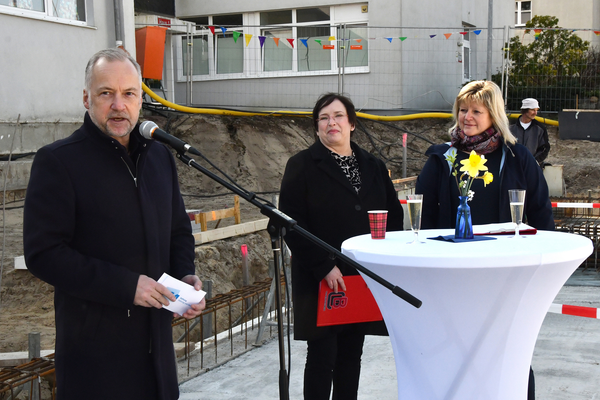 Dadurch sei erst ein Mehrbedarf an Plätzen in Krippe und Kindergarten entstanden und längst auch im Hort. Die VHS-Bildungswerk GmbH als Träger des Hortes und als langjähriger zuverlässiger Kooperationspartner der Schule am Krugpark schafft mit dem Neubau nicht nur ein Plus an Hortplätzen, sondern auch Schulraumkapazitäten. Denn die wachsende Schülerzahl führte auch zu einem Defizit an Fachräumen im Schulgebäude.