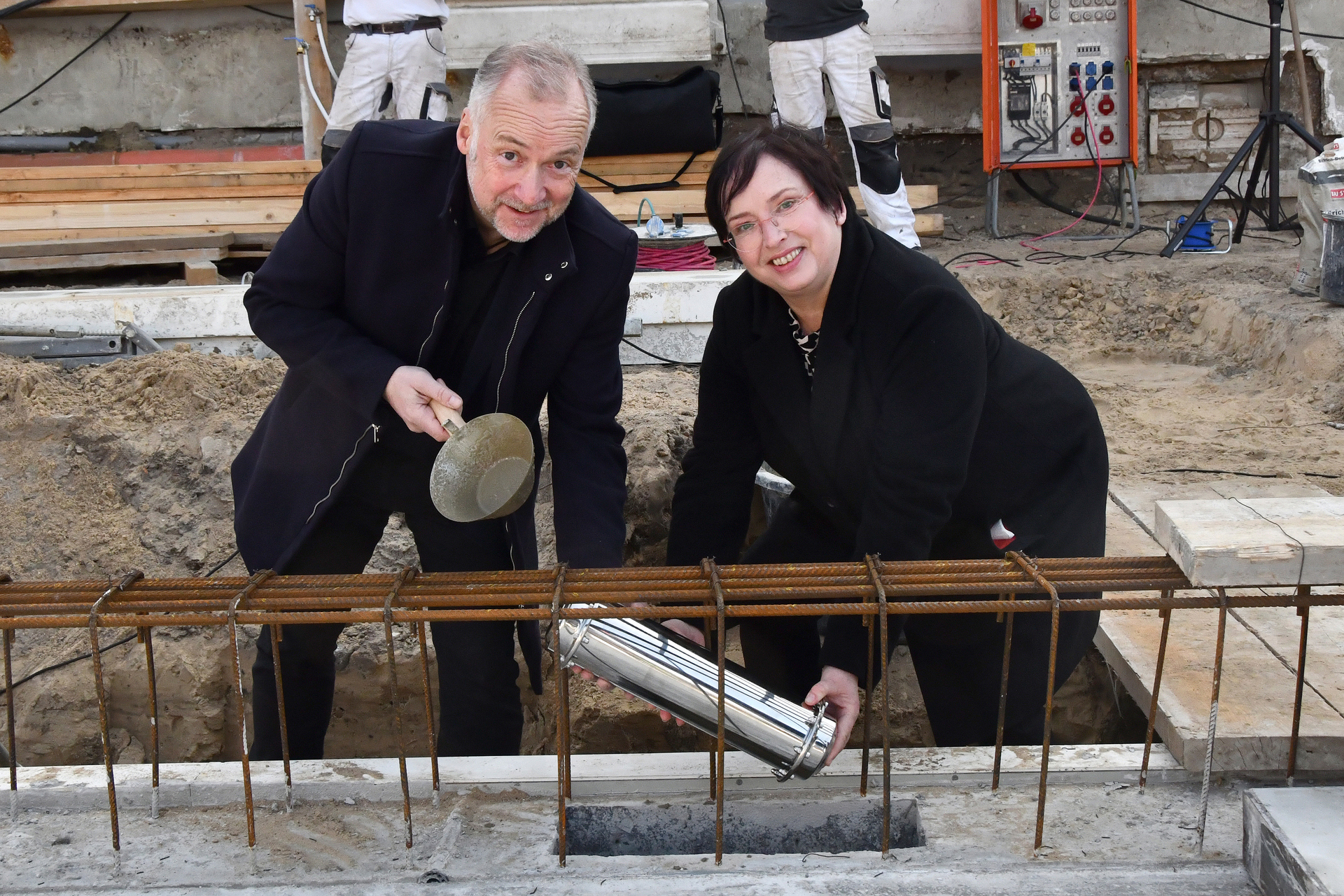 Die nun gefeierte Grundsteinlegung soll dazu führen, dass ab dem Schuljahr 2025/26 statt 208 Kinder (derzeit temporär erhöht auf 228) fortan ca. 300 Kinder betreut werden können. Die Stadt unterstützt das Vorhabens zur dauerhaften Sicherstellung der Rechtsansprüche insbesondere im Bereich Eigene Scholle sowie zur Entlastung der erheblich nachgefragten Kitas in der Innenstadt und am Ring. Zudem beinhalten der Umbau und die Erweiterung der Kindertagesstätte neben der Errichtung von Stellplätzen auch die Nutzungsänderung des zweiten Obergeschosses im Bestandsgebäude für Klassenräume. Der nahen Grundschule am Krugpark bringt das VHS-Vorhaben vier Klassenräume unter anderem für Musik, Wirtschaft-Arbeit-Technik (WAT) und Kunst ein, dazu einen Versammlungsraum, ein Lehrerzimmer mit Küchenzeile, dazu ein Materiallager und Toiletten. Dadurch kann die Schule künftig durchgehend zweizügig betrieben werden.
