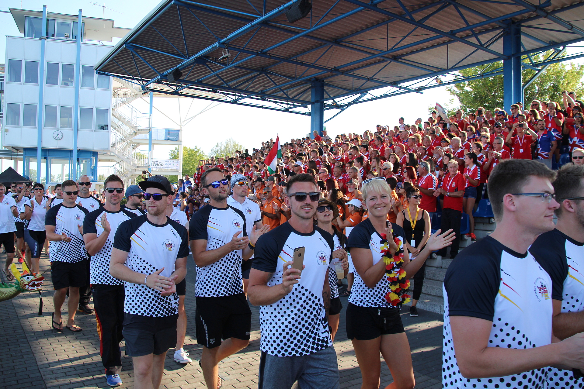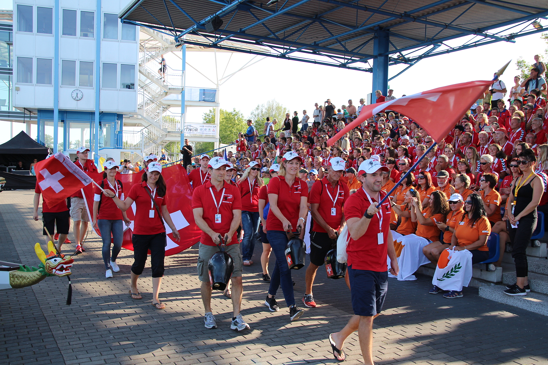 Mit einer eindrucksvollen Eröffnungsveranstaltung wurde am Mittwoch, 22.08.2018, auf der Regattastrecke „Beetzsee“ in Brandenburg an der Havel der Auftakt zur diesjährigen Drachenboot-EM für Nationalmannschaften vollzogen. Bei herrlichem Sonnenschein und hochsommerlichen Temperaturen begann pünktlich um 17:00 Uhr der Einmarsch der über 1.000 Sportlerinnen und Sportler aus den 18 teilnehmenden Nationen.
