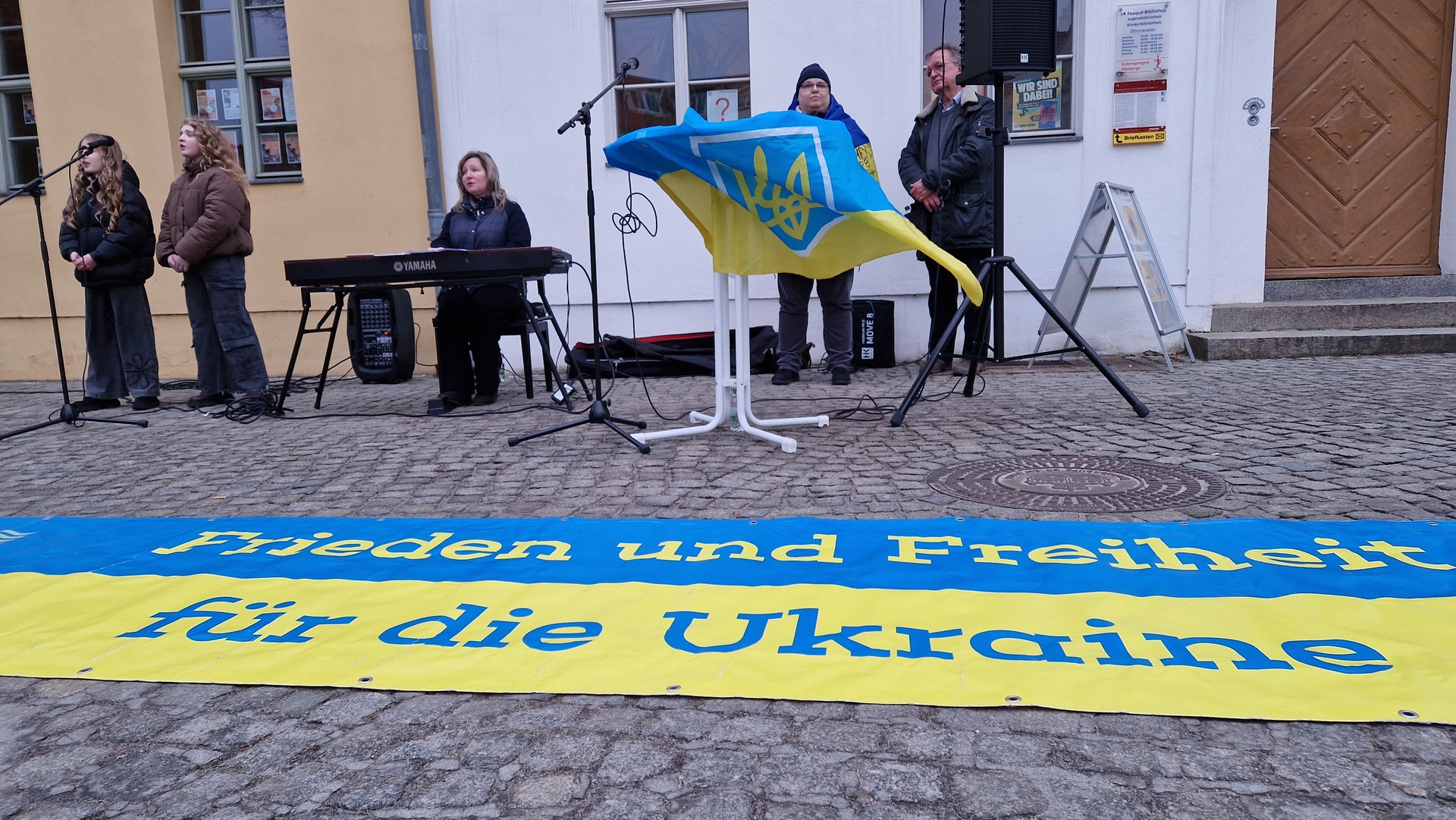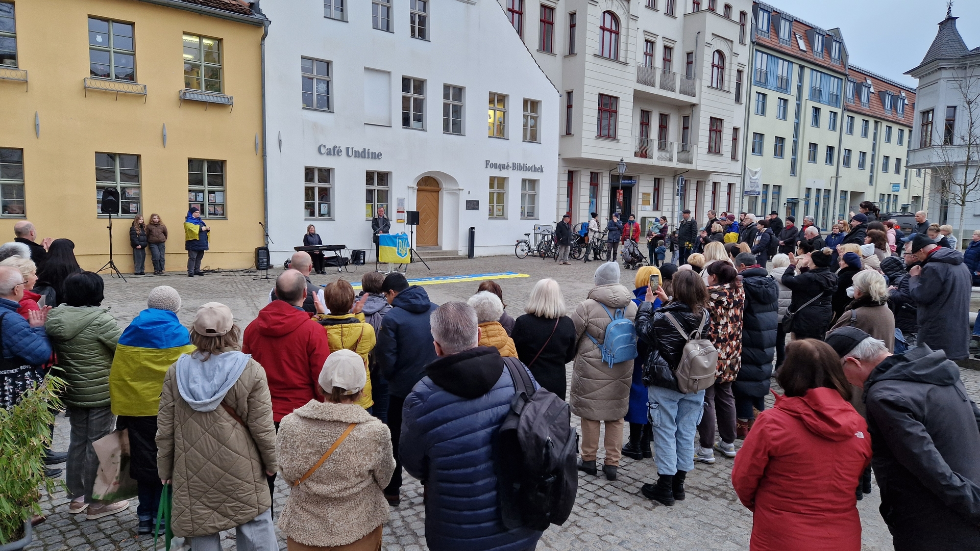 Am 24. Februar 2025 trafen sich etwa 170 Menschen auf dem Altstädtischen Markt, um an den 3. Jahrestag des Kriegsbeginns in der Ukraine zu erinnern. Am 24. Februar 2022 hatte die Invasion russischer Truppen in die Ukraine begonnen. Seitdem hat der Angriffskrieg Russlands für unermessliches Leid und unvorstellbare Zerstörung gesorgt. Laut UNHCR (Hoher Flüchtlingskommissar der Vereinten Nationen) soll es seit Kriegsausbruch 6,5 Millionen Flüchtlinge aus der Ukraine geben und mehr als 10.000 zivile Opfer.