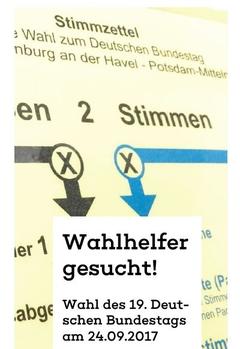 zur Durchführung der Bundestagswahl am 24.09.2017 in der Stadt Brandenburg an der Havel werden für die 65 Wahlbezirke im Stadtgebiet ca. 670 Wahlhelferinnen und -helfer gesucht. Viele freiwillige Bürger haben sich bereits als Wahlhelfer aufstellen lassen. Dennoch sind wir noch immer auf Ihre Unterstützung in fast allen Stadtteilen angewiesen, ganz besonders aber in den Stadtteilen Neustadt, Hohenstücken, Plaue und im Ortsteil Wust.