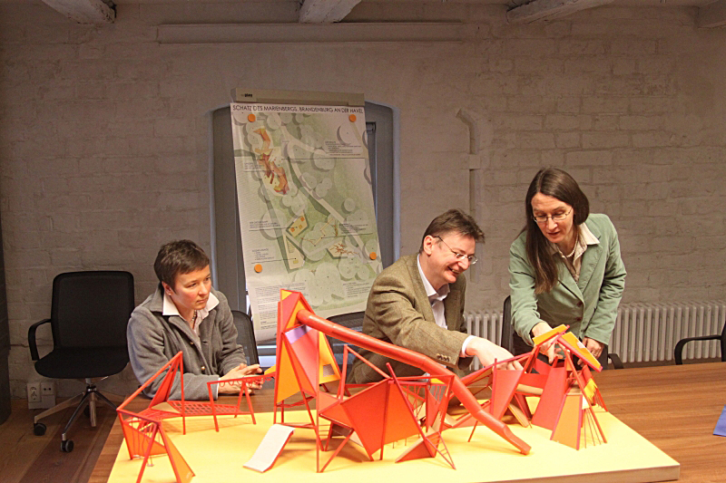 Bereits im Herbst 2012 bastelten und zeichneten Junior-Expertinnen und -Experten im Alter zwischen fünf und elf Jahren ihre Wünsche und Ideen für den Spielplatz. Unterstützt wurden sie vom BUGA-Mitmach-Team. In insgesamt vier Workshops ist so ein großer Fundus an Anregungen entstanden, aus dem Frau Hack schöpfen konnte. Sehr viele der Ideen konnte sie in ihre Fachplanung integrieren. In der gestrigen Abschlusspräsentation haben die kleinen Planerinnen und Planer die Umsetzung ihrer eigenen Ideen mit Augen und Händen am Modell nachvollzogen.