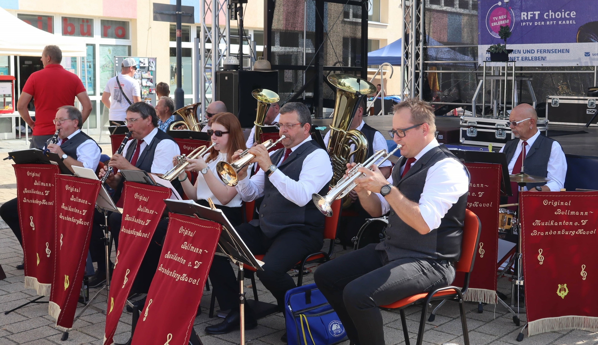 Weiterhin konnten die Besucher an dem bunten Treiben auf dem gesamten Marktplatz teilnehmen. Dort gab es viele Erlebnisstände wie Bullriding, Basketball, Loseziehen, einen Surfsimulator, Hüpfburgen, Riesen-Schach und Glücksrad sowie Informationsstände von verschiedenen Parteien und Organisationen aus der Havelstadt.