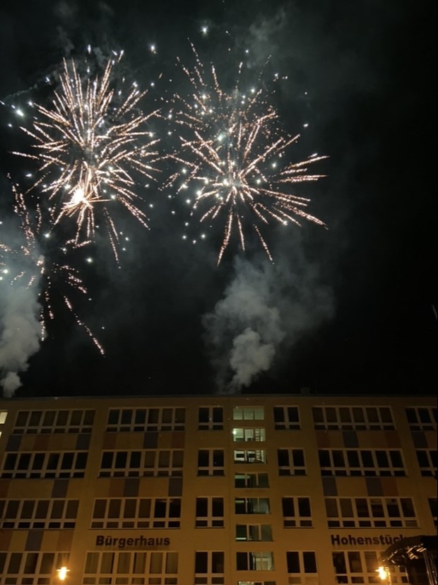 Ab 17 Uhr bat dann die Rock-Band Mellikey zum Tanz und ließ die Menge bis 21 Uhr ausgelassen feiern. Den Abschluss des Stadtteilfestes bildete das stimmungsvolle Feuerwerk von „Pyromagie Feuerwerke“ vom Dach des Bürgerhauses.