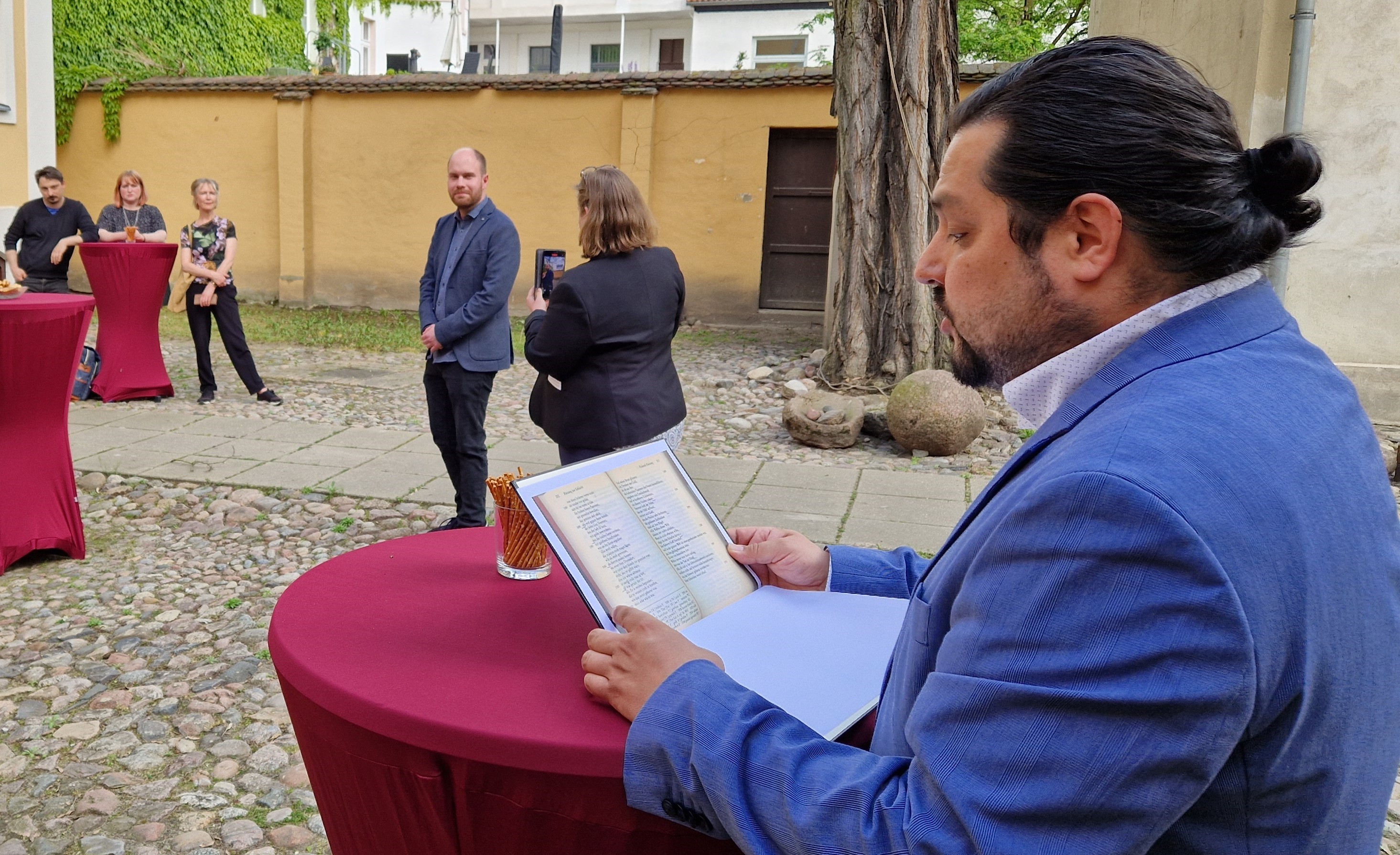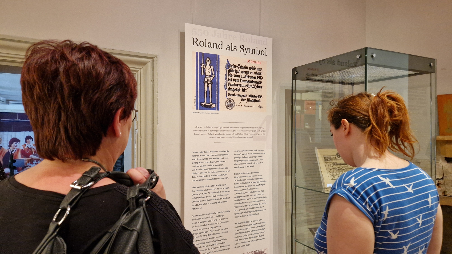 Außerdem wird der Ursprung aller Rolande aufgeklärt, der nämlich „auf die gleichnamige historische und literarische Figur“ zurückgeht. „Hruodland“ war um 800 n. Chr. ein Feldherr und Markgraf der Bretagne und fiel im heutigen Spanien in einer Schlacht gegen baskische Truppen. Daraus formte sich eine Heldensage und das sogenannte „Rolandlied“, dessen mittelhochdeutsche Variante im 12. Jahrhundert große Popularität erlangte. Schauspieler Steffan Drotleff las zur Ausstellungseröffnung Passagen aus dem Rolandlied vor, wobei die Zuhörerschaft Drotleffs Trainingserkenntnis teilte: