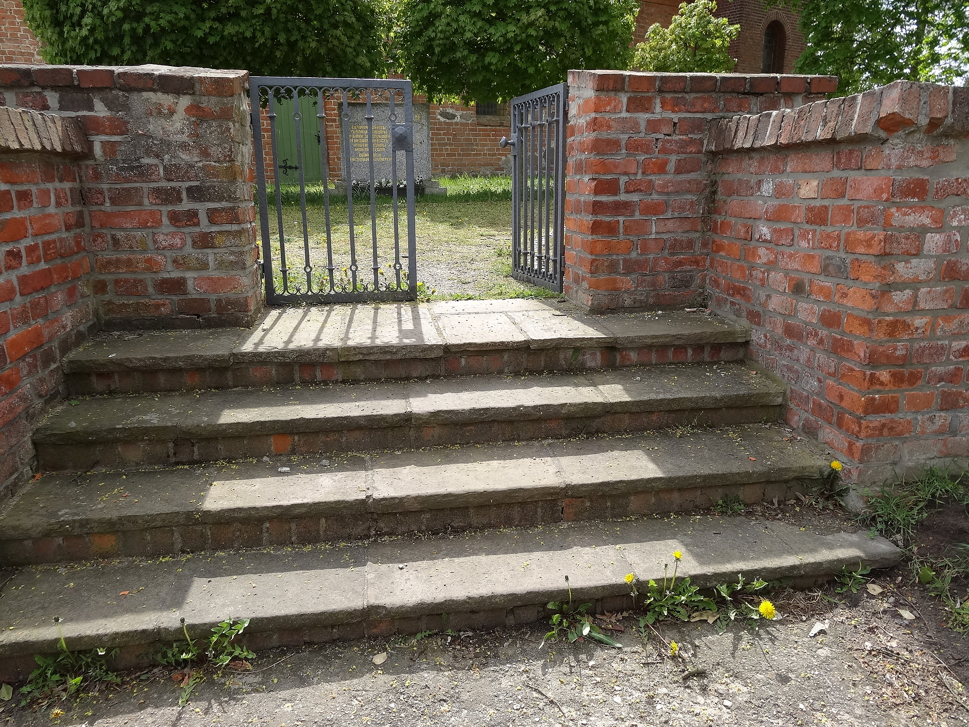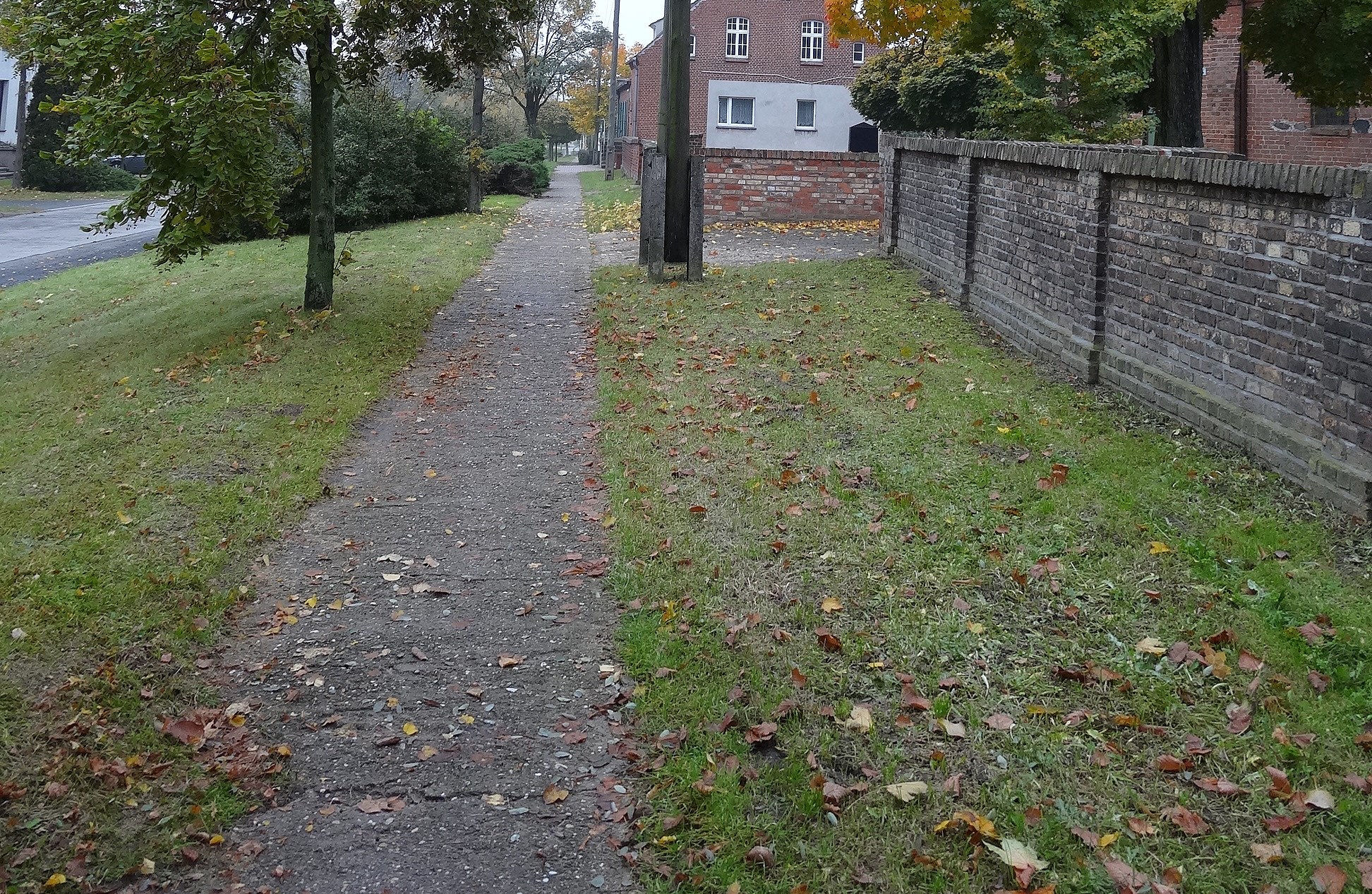 Der Bereich des Zugangs zur Kirche und zum Friedhof an der Treppe bzw. Eingangstür wird komplett erneuert. Im Rahmen des Bauvorhabens erfolgt die abschnittsweise Erneuerung des Gehweges. Der Gehweg wird in Betonpflaster Farbton herbstbunt wie vorhanden weiter geführt. Die vorhandene Breite des Weges bleibt erhalten. Die vorhandene Verkehrsfläche besteht aus einer 4,0 m breiten Fahrbahn aus Beton. Dem schließt sich in südl. Richtung ein ca. 2,0 m breiter unbefestigter Seitenstreifen an. Der geplante Längsparkstreifen wird unmittelbar an den vorhandenen südlichen Fahrbahnrand angebaut. Hier werden diese 9 Parkstände in Längsaufstellung angeordnet.
