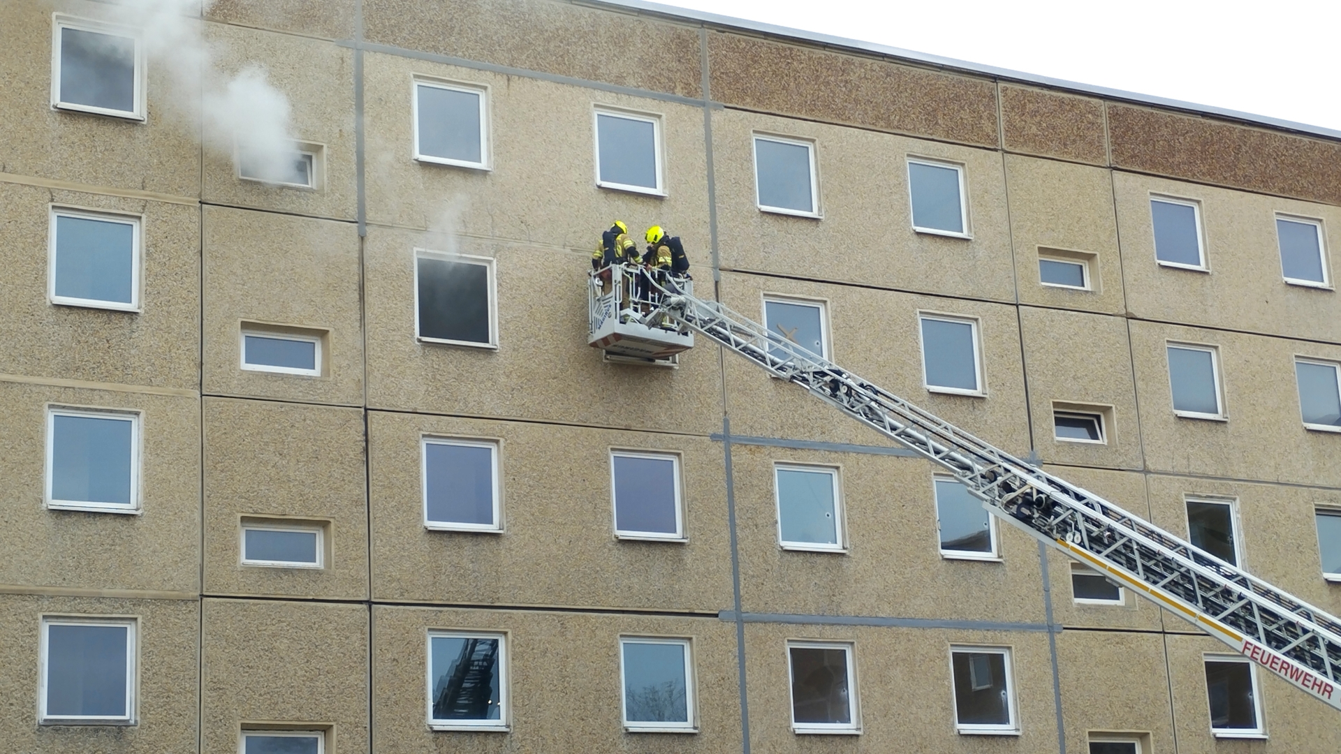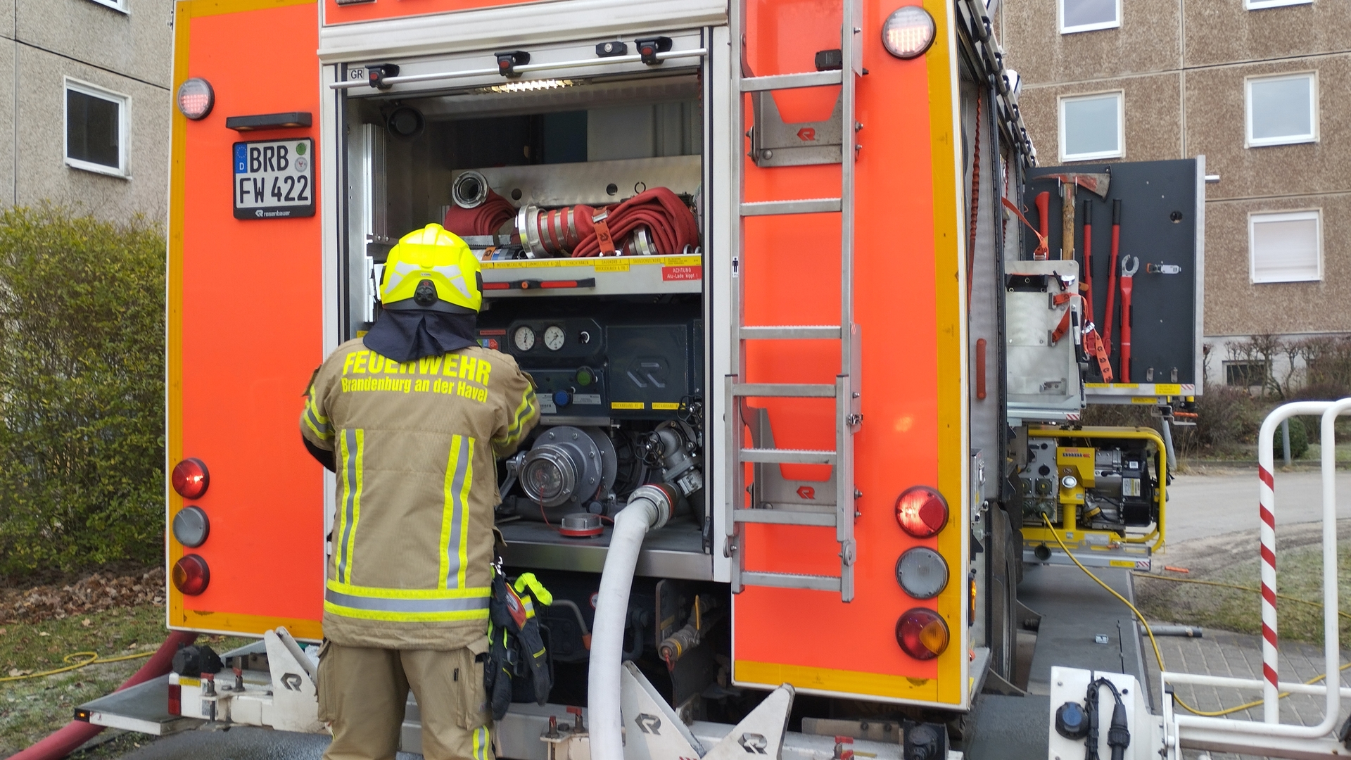 Die Übungsleiter haben in dem Wohnblock mit vier Eingängen einen Wohnungsbrand im dritten Obergeschoss in Szene gesetzt. Dichter Rauch quoll aus den Fenstern, der mit Rauchkörpern ein Feuer in einer Wohnung simulierte. Kurz darauf waren auch schon die Sirenen zu hören und der komplette Löschzug der Berufsfeuerwehr Brandenburg bog um die Ecke.
