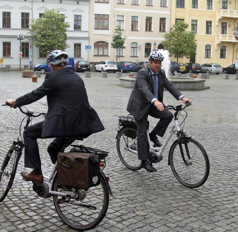 Im Rahmen des nachhaltigen Projektes Elektromobilität der Stadtwerke Brandenburg an der Havel GmbH (StWB) stellten heute die StWB Geschäftsführer, Uwe Müller und Benno Felsch, der Stadtverwaltung Brandenburg an der Havel zusätzlich zu dem 2012 übergebenen E-Auto „Twizy“ zwei Elektrofahrräder zu Testzwecken und Dienstfahrten zur Verfügung.