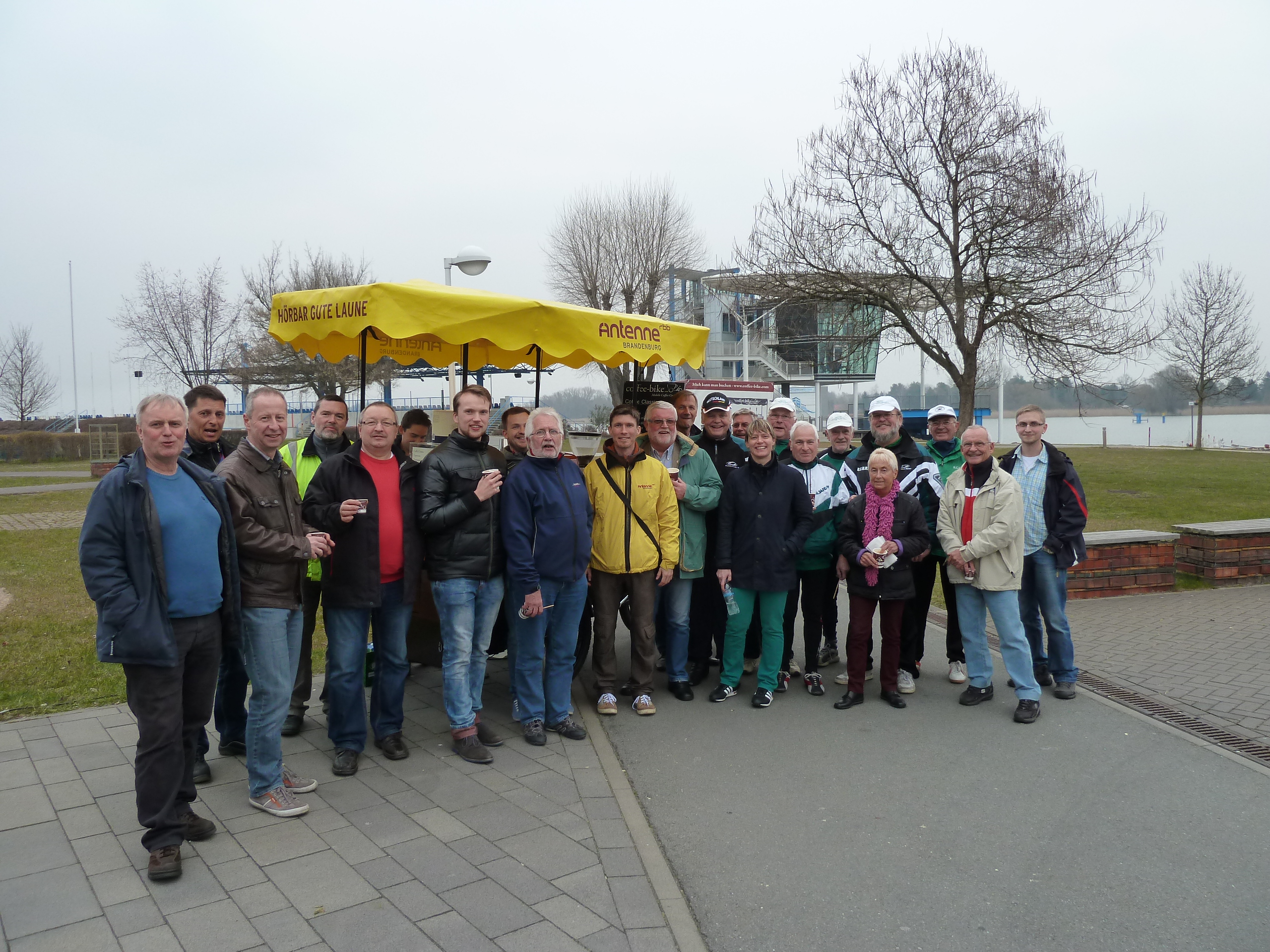 Vor seiner monatlichen Sitzung am 24. April 2015 erhielt das Organisationsteam für die Ruder-EM 2016 Besuch vom Kaffeemobil von Antenne Brandenburg. Kurz nach dem das optisch und funktional interessante Gefährt zwischen Funktionsgebäude und Zielturm auf dem Gelände der Regattastrecke „Beetzsee“ in Brandenburg an der Havel aufgestellt und der Kaffeeautomat in Gang gesetzt wurde, gab es bereits die ersten leckeren Getränke. Die Palette reichte dabei vom „normalen“ Kaffee über Latte Macchiato, Cappuccino und Espresso bis hin zu heißer Schokolade und Milchkaffee. Auch eine Gruppe von Ruderern des RCHB, die gerade von einer Ausfahrt zurückkehrten und kurz Station machten, ließen sich die leckeren Kaffeespezialitäten schmecken.