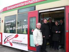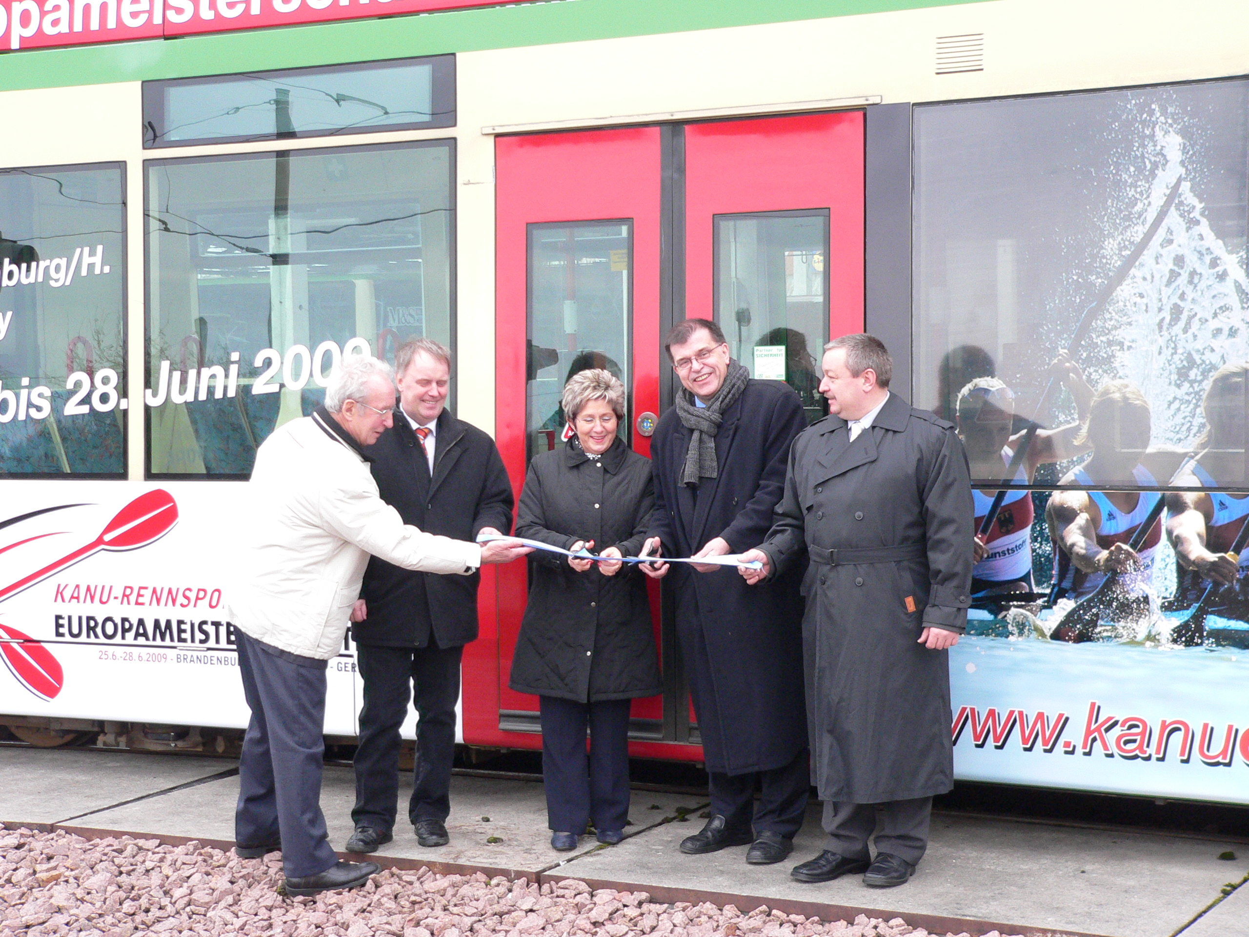 Am 26.02.2009 haben Oberbürgermeisterin Dr. Dietlind Tiemann, Verkehrsbetriebe-Chef Werner Jumpertz, Manfred Schubert, Vizepräsident des Landes-Kanu-Verbandes Brandenburg e.V. und Michael Kenzler, stellvertretender Cheforganisator der diesjährigen Europameisterschaften im Kanurennsport, die „EM-Straßenbahn“ auf Fahrt geschickt. Das moderne Niederflurfahrzeug der Verkehrsbetriebe der Stadt Brandenburg an der Havel GmbH (VBBr) wird in den verbleibenden 119 Tagen bis zum Beginn des diesjährigen Titeltreffens der europäischen Kanu-Elite in der Havelstadt für dieses große internationale Sportereignis werben.