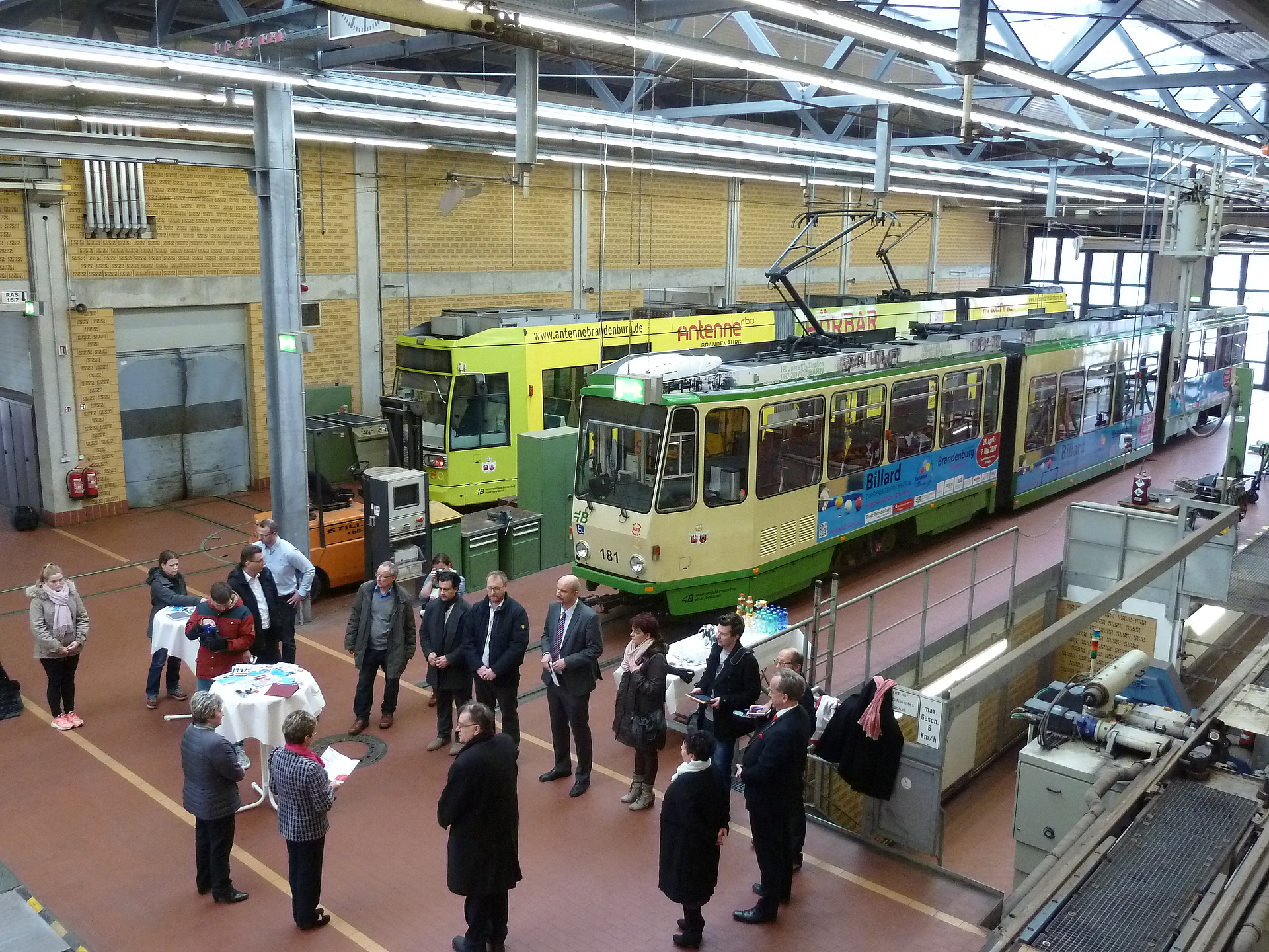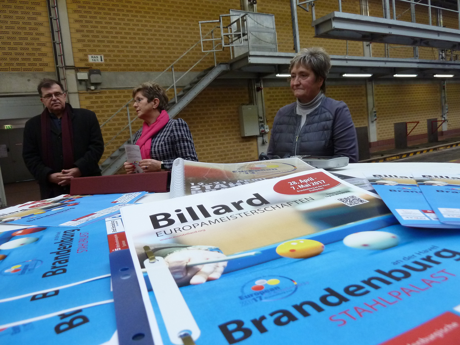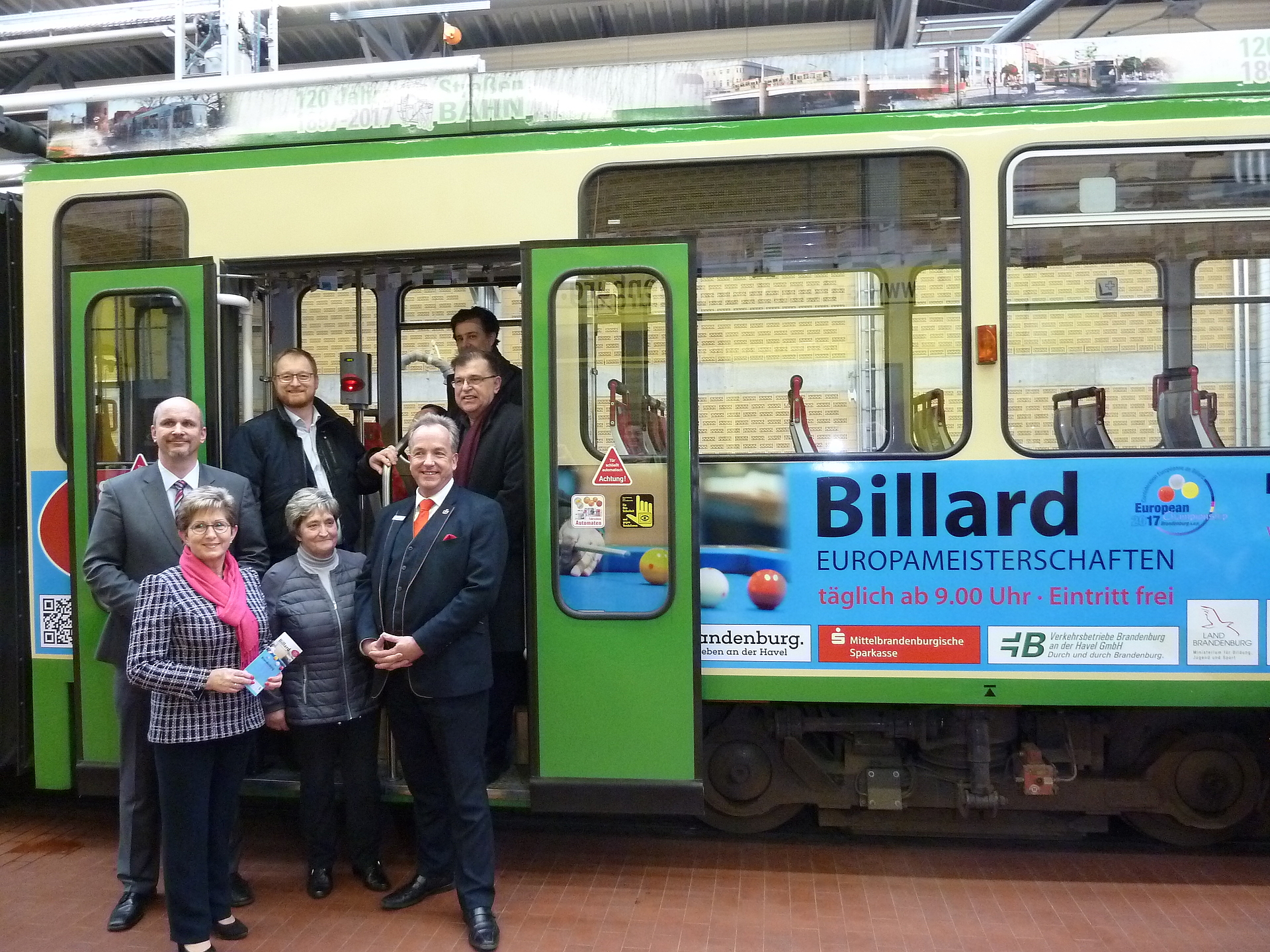 Am Donnerstag, 02.03.2017, wurde im Beisein von Oberbürgermeisterin Dr. Dietlind Tiemann der lokalen Presse eine Straßenbahn der Brandenburger Verkehrsbetriebe (VBBr) vorgestellt, die ab sofort bei ihrer Fahrt durch die Havelstadt mit großflächiger Werbung auf die demnächst stattfindende Billard-Europameisterschaft 2017 aufmerksam macht. EM-Cheforganisatorin Helga Blawid begrüßte bei der Präsentation der EM-Straßenbahn in der Technikhalle auf dem Betriebshof in der Upstallstraße neben der Oberbürgermeisterin und dem VBBr-Geschäftsführer Jörg Vogler auch den MBS-Marktdirektor Ronald Priebe und den Vorstandsvorsitzenden des Stadtsportbundes Werner Jumpertz sowie weitere Unterstützer dieser wichtigen internationalen Sportveranstaltung. Das weit über die Grenzen der Stadt hinaus bekannte Brandenburger Billard-Urgestein, das mit seinem ehrenamtlich tätigen Organisationsteam schon 2013 und 2015 sehr erfolgreich die gemeinsame Billard-EM für alle Karambol-Disziplinen vorbereitet und durchgeführt hatte, bedankte sich bei der Stadt und dem Land Brandenburg sowie den Sponsoren für die auch diesmal wieder gewährte Unterstützung. Helga Blawid lud alle Brandenburgerinnen und Brandenburger ein, während der EM im Stahlpalast vorbei zu schauen, um die tolle Atmosphäre einer solchen hochkarätigen Meisterschaft live zu erleben – zumal der Eintritt an allen Wettkampftagen frei ist.