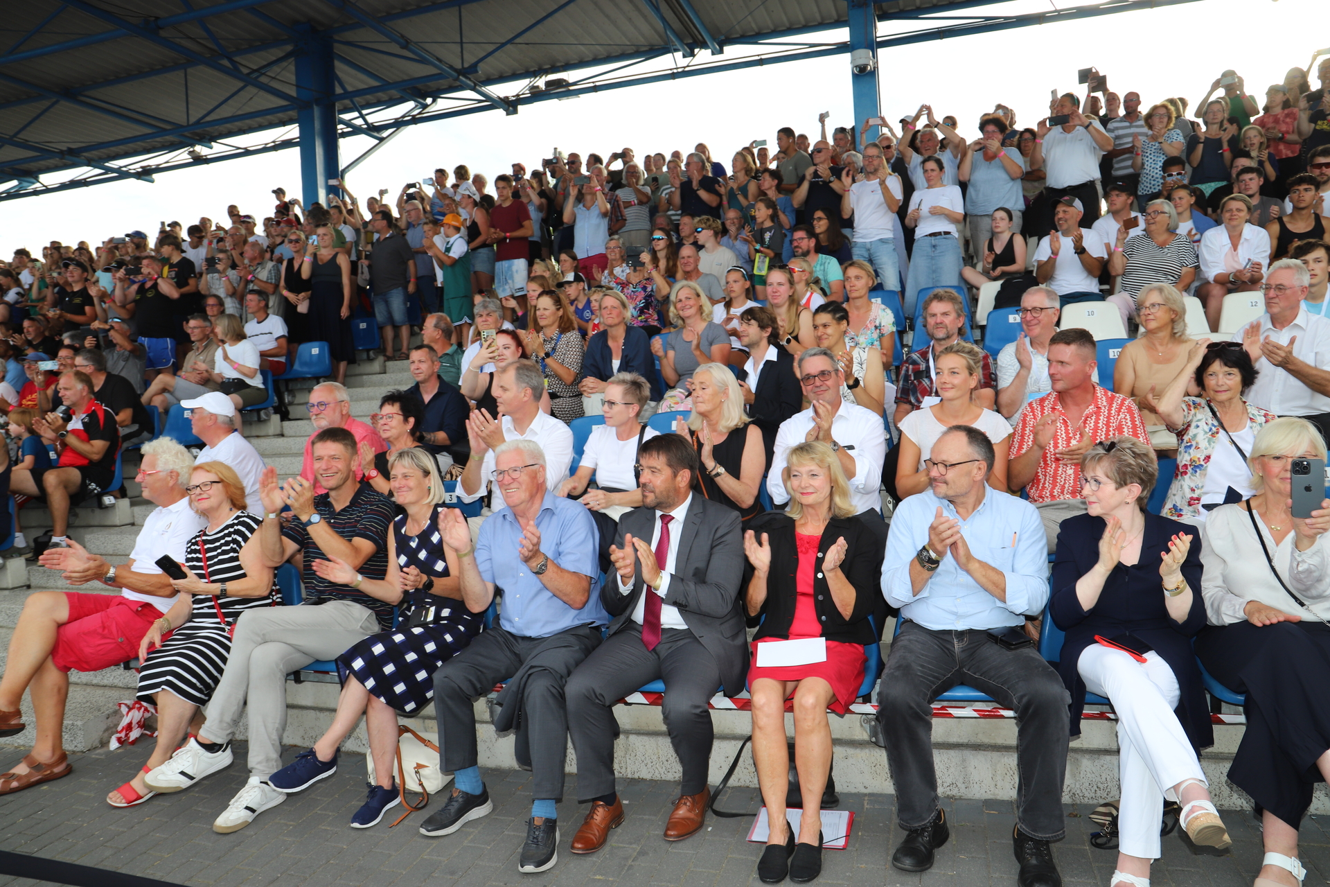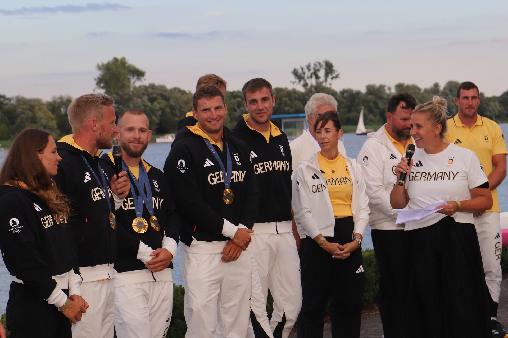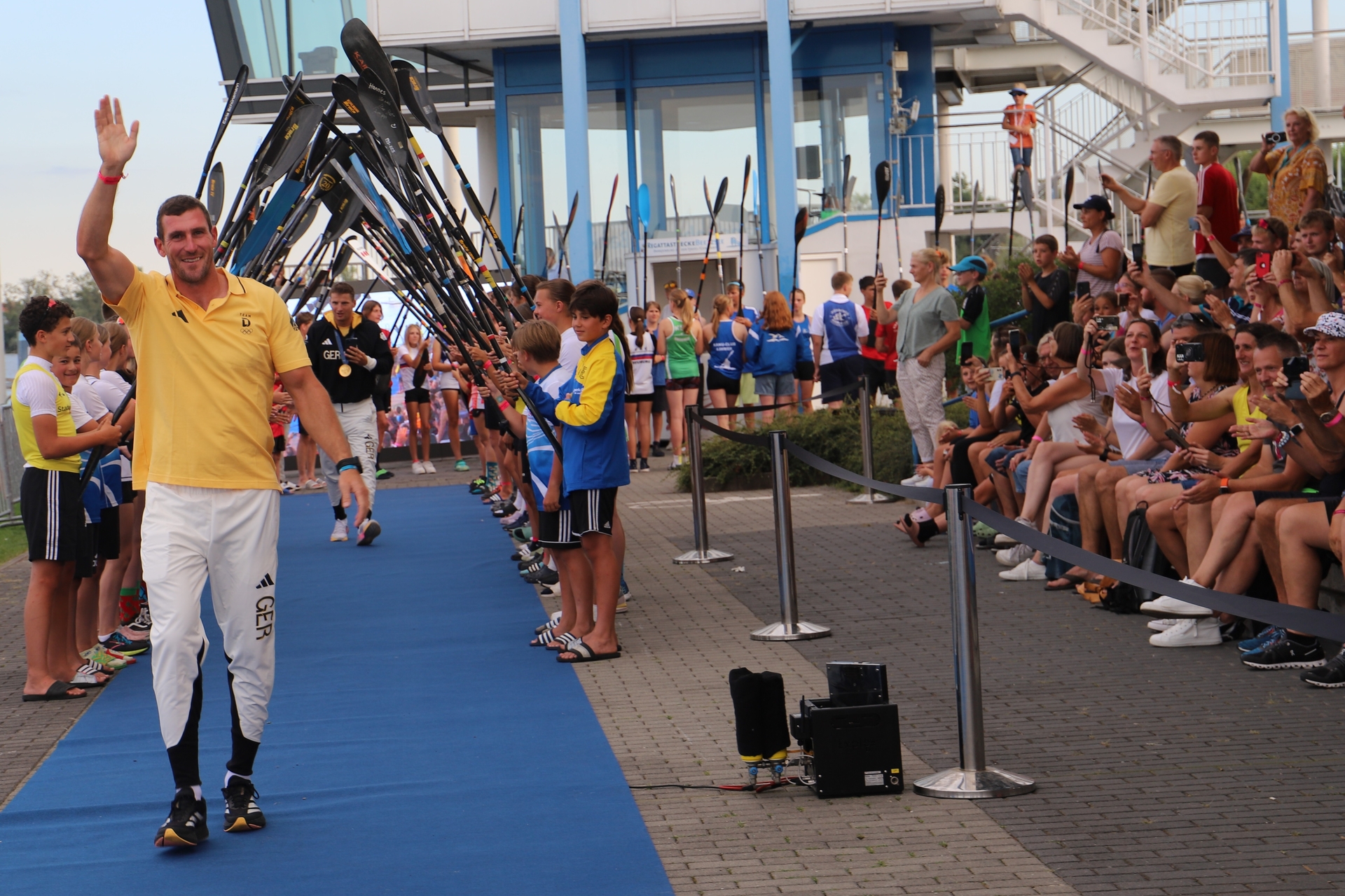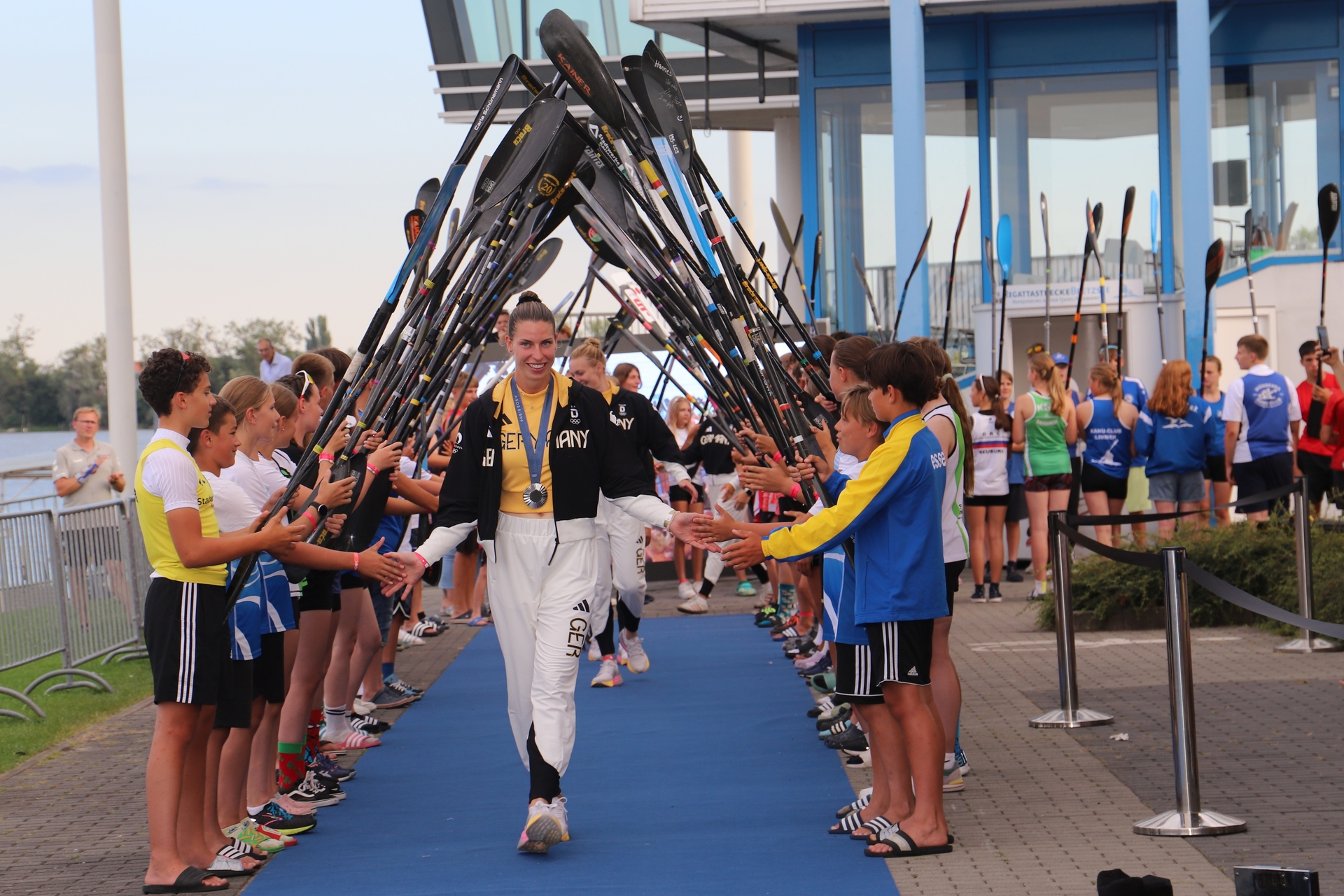 Unter großem Beifall und La-Ola-Welle liefen sie unter einem Paddel-Spalier, das Sprtler aus allen Landesverbände bildeten, vor der Tribüne ein und kommentierten ihre Erlebnisse von den Olympischen Spielen in Paris.