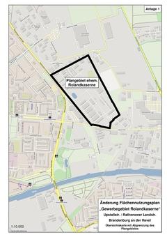 Die Stadtverordnetenversammlung der Stadt Brandenburg an der Havel hat in ihrer Sitzung am 28.06.2017 den Entwurf der 10. Änderung des Flächennutzungsplans der Stadt Brandenburg an der Havel für das Vorhaben „Gewerbegebiet Rolandkaserne“ gebilligt und zur Auslegung beschlossen. Der Änderungsbereich des Flächennutzungsplans bezieht sich auf die ehemals militärische Liegenschaft der Rolandkaserne im Stadtteil Hohenstücken, welcher im Süden an die Upstallstraße, im Westen an die Rathenower Landstraße und im Norden und Osten an das Industriegebiet Nord-Hohenstücken grenzt sowie das Gelände der Schützengilde. Der beigefügte Kartenausschnitt kennzeichnet das Änderungsgebiet.