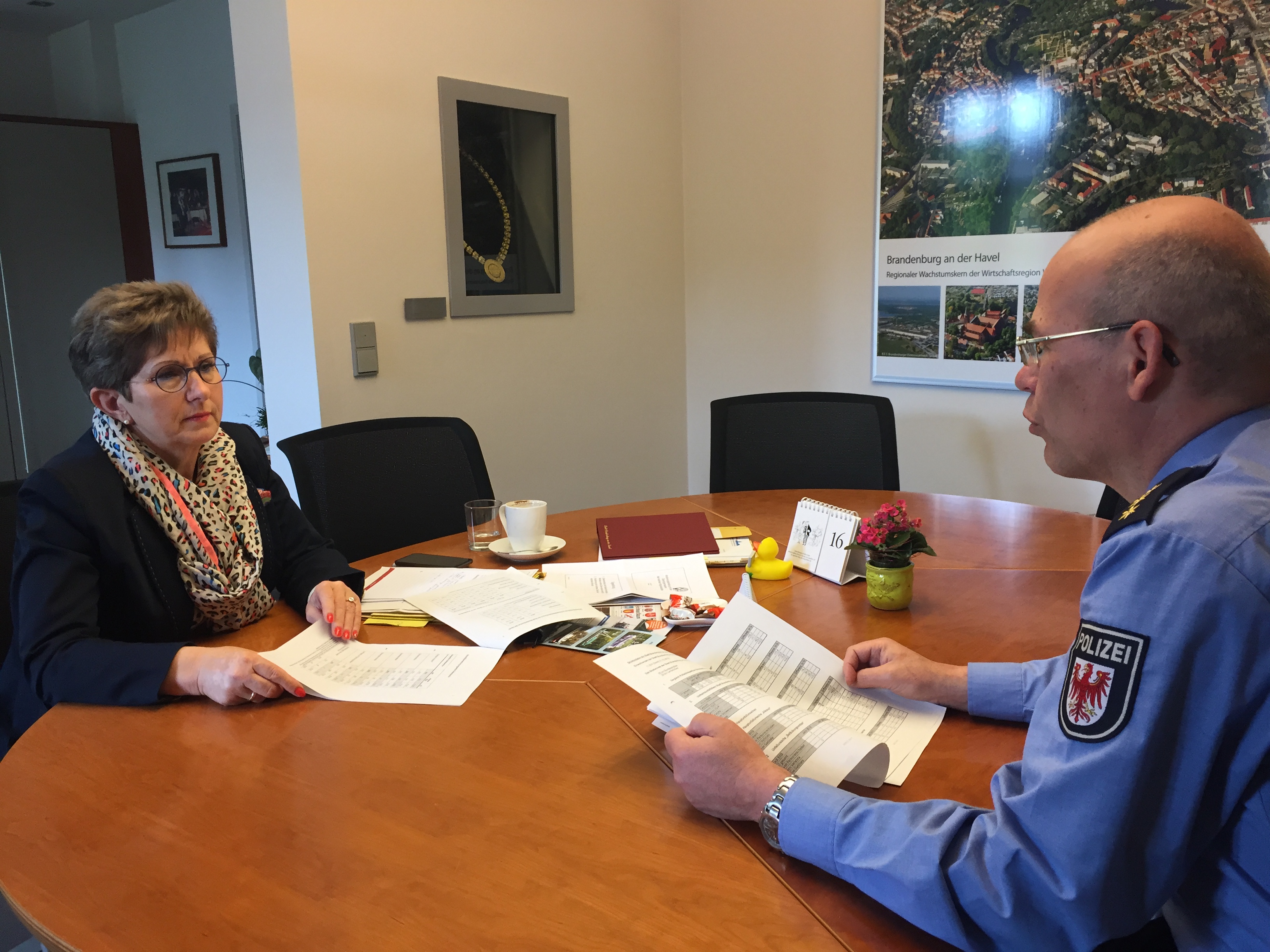 „Die Polizistinnen und Polizisten leisten gute Arbeit für die Bürger in unserer Stadt“, sagt Oberbürgermeisterin Dietlind Tiemann im Nachgang des regelmäßigen Sicherheitsgespräches zur Auswertung des Jahres 2016 mit dem Leiter der Polizeiinspektion Brandenburg an der Havel, Mathias Tänzer.