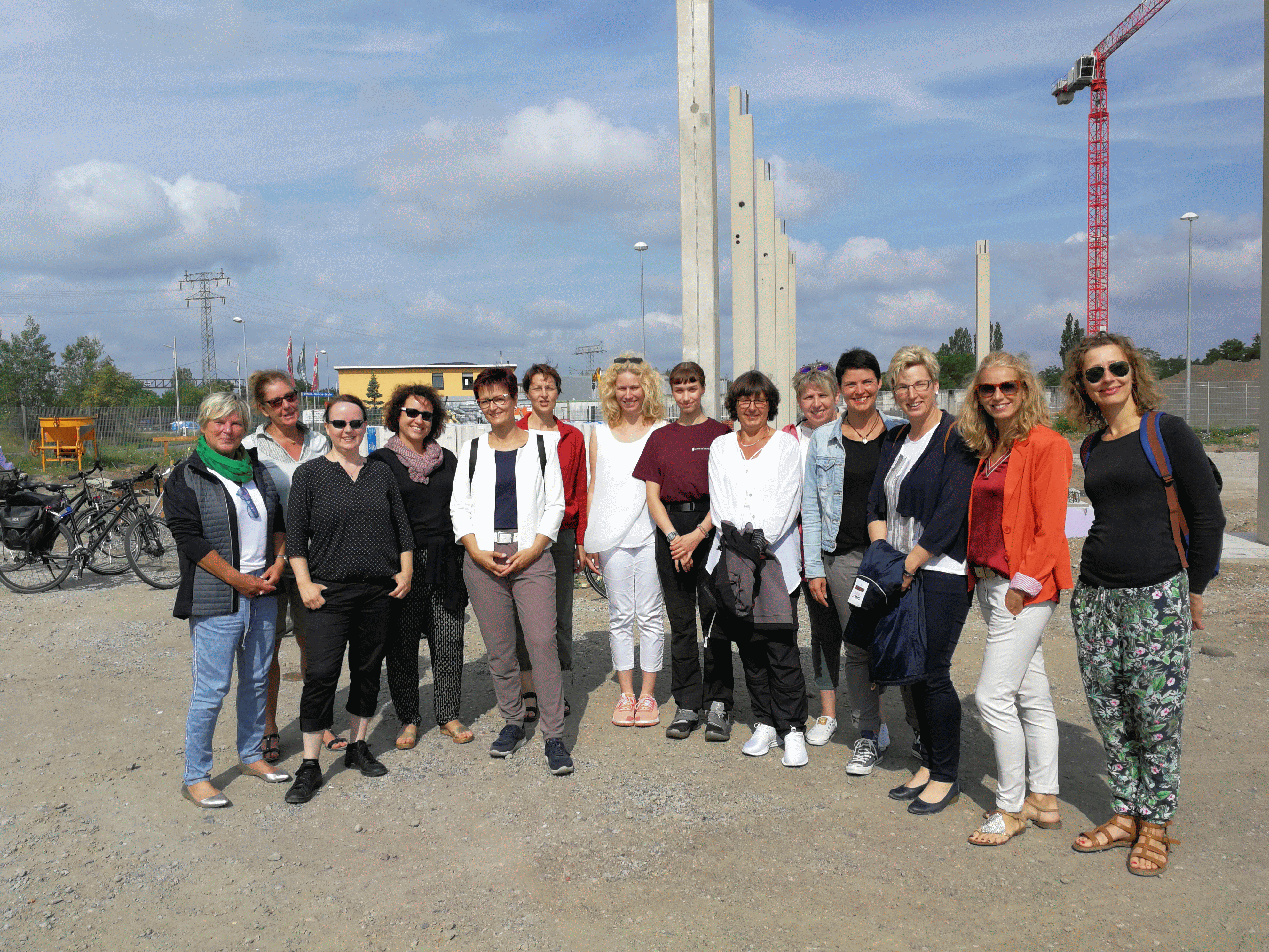 Start des Rundkurses war das Technologie- und Gründerzentrum (TGZ). Die Radtour unter dem Motto „Bewegen – Kennenlernen – Stärken“ bot interessante Einblicke in die Welt von Chefinnen und lockte ganz nebenbei mit einem sportlichen Vormittag an der frischen Luft. Die Tour führte zunächst zu Romy Lange, Geschäftsführerin vom Logistikunternehmen Lange & Töchter GmbH Internationale Transporte. Sie berichtete über ihren beruflichen Werdegang und die erfolgreiche Übernahme eines gestandenen Familienunternehmens. Außerdem präsentierte sie nicht ohne Stolz den aktuellen Bauplatz in der Spittastraße, wo auf 2,7 ha Fläche bis zum 30. Firmenjubiläum im nächsten Jahr ein neues Firmengelände mit großer Lagerhalle nebst Verwaltungsgebäude und Stellplätzen für die LKW-Flotte entstehen soll.