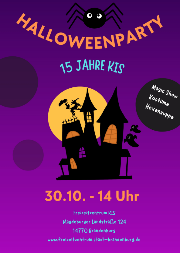 Am Mittwoch, dem 30. Oktober 2024 ab 14:00 Uhr, lädt das Team des Freizeitzentrums KIS Jung und Alt herzlich ein, um mit ihnen gemeinsam eine schaurig schöne Halloweenparty und 15 Jahre Freizeitzentrum KIS zu feiern.