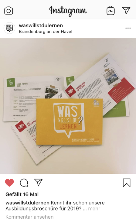 Neu ist auch der Instagram-Account der Ausbildungskampagne „Was willst du? Lernen.“ (@waswillstdulernen), die vom Projektbüro der Wirtschaftsregion Westbrandenburg getragen und von der Wirtschaftsförderung der Stadt Brandenburg unterstützt wird. Aus Befragungen unter Jugendlichen und jungen Erwachsenen wurde deutlich, dass Instagram in den vergangenen Jahren zum wichtigsten Online-Kanal der zentralen Zielgruppe der Ausbildungskampagne aufgestiegen ist.
