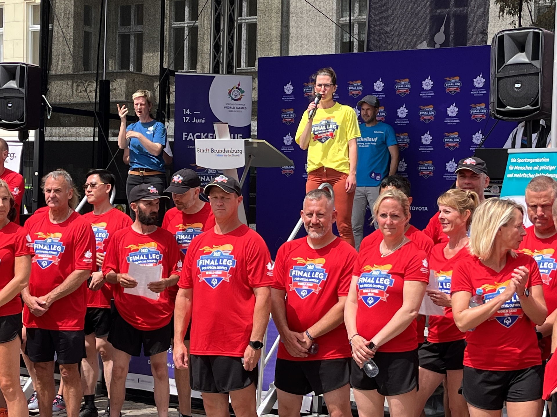 Mit einer riesen inklusiven Party haben die Brandenburgerinnen und Brandenburger am Donnerstag, 15. Juni 2023, die Olympische Fackel und die Läufer des Law Enforcement Torch Run (LETR) der Special Olympic World Games 2023 auf dem Altstädtischen Markt empfangen. Gestartet waren die über 100 internationalen Läuferinnen und Läufer, darunter Special Olympics Athletinnen und Athleten sowie Polizistinnen und Polizisten am Neustädtischen Markt, wo sie von Oberbürgermeister Steffen Scheller empfangen wurden.