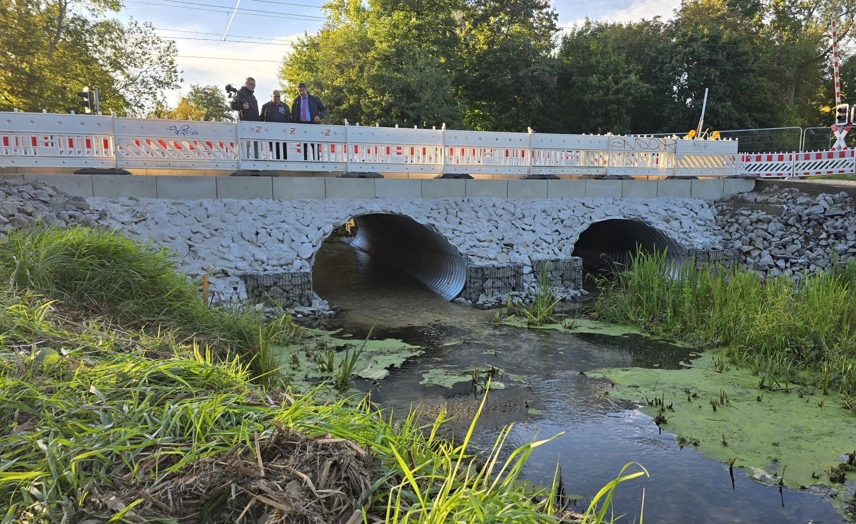 Das noch fehlende Geländer an der Brücke hat laut Tiefbauamtsleiter Christian Fuß keinen Einfluss auf eine mögliche Brückenfreigabe, das war zur Bestellung im Bauablaufplan ohnehin erst vorgesehen, wenn die Borde und Betonseiten gesetzt sind, um sie nach den individuellen Maßen ausrichten zu können. Die Montage ist für Oktober vorgesehen.