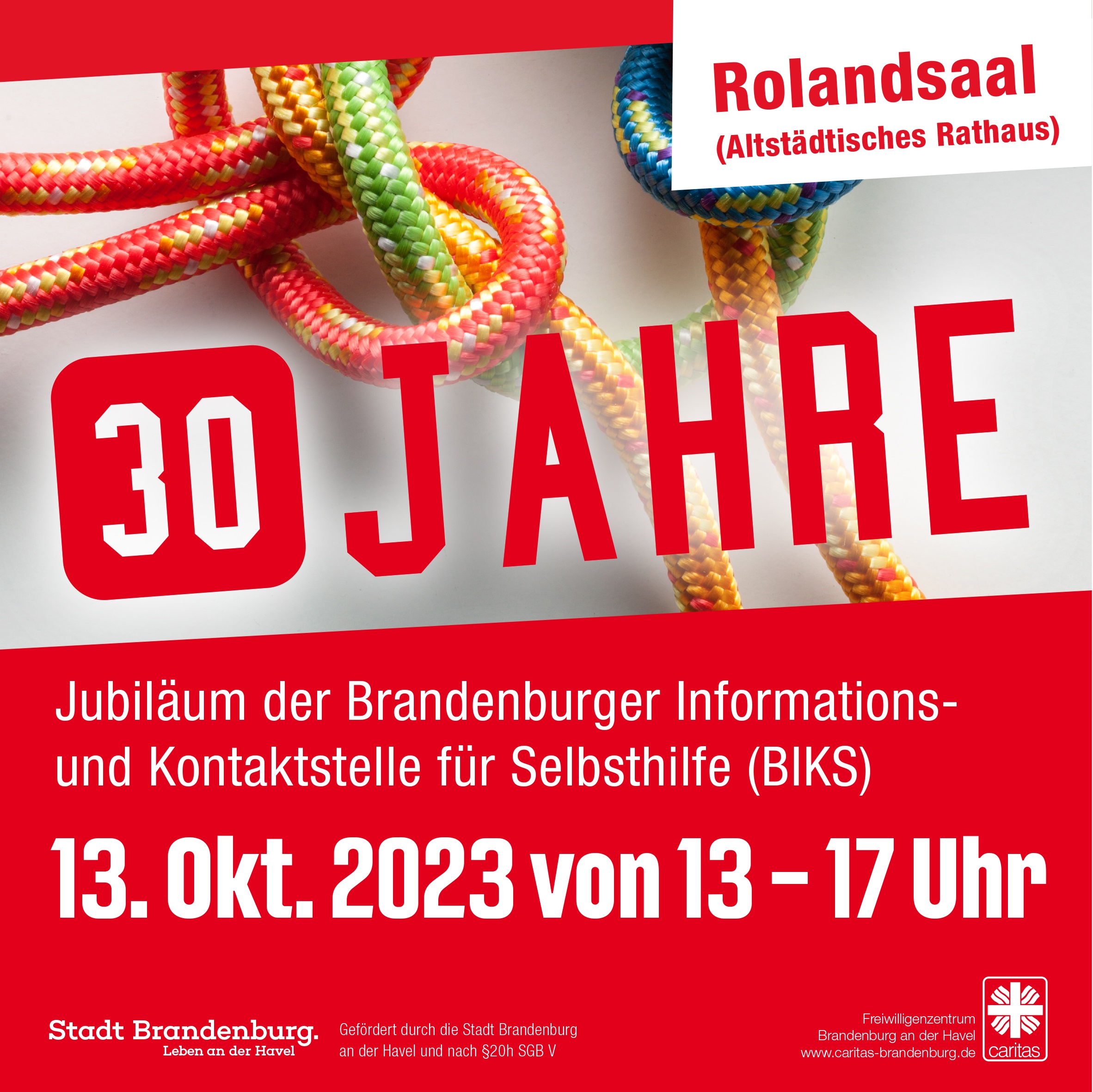 Am Freitag, dem 13. Oktober 2023, lädt die Brandenburger Informations- und Kontaktstelle für Selbsthilfe (BIKS) alle Bürgerinnen und Bürger anlässlich ihres 30-jährigen Jubiläums zur Festveranstaltung von 13:00 bis 17:00 Uhr im Rolandsaal im Altstädtischen Rathaus von Brandenburg an der Havel ein.