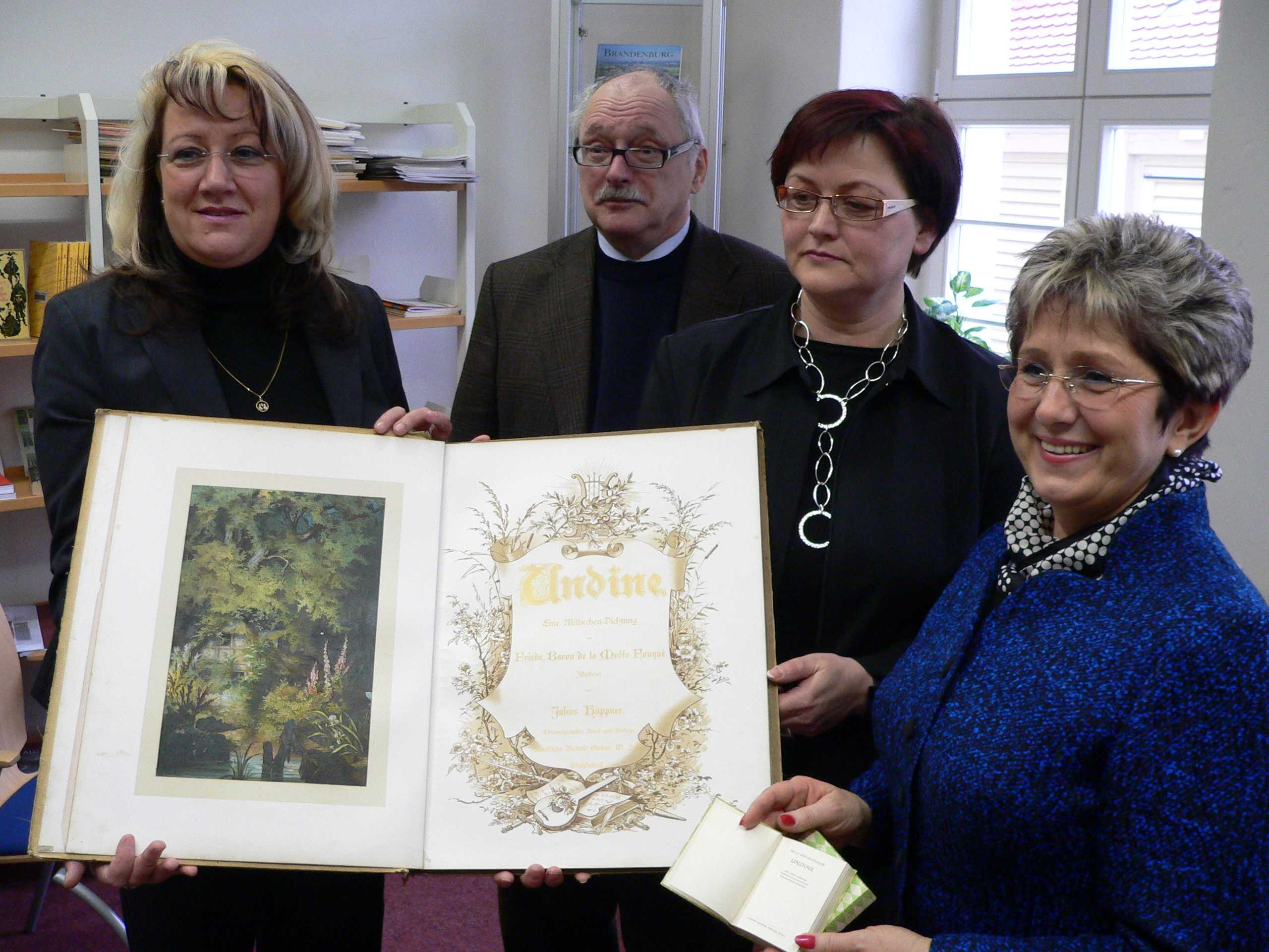 Um eine Sammlung von illustrierten Werken des in Brandenburg an der Havel geborenen Schriftstellers Friedrich de la Motte Fouqué ist die Havelstadt seit Donnerstag, 12.02.2009, reicher. Am Geburtstag des Namensgebers der städtischen Bibliothek konnten Oberbürgermeisterin Dr. Dietlind Tiemann und Bibliotheksdirektorin Cornelia Stabrodt die großzügige Schenkung aus den Händen von Kerstin Neitzel, Leiterin der Brandenburger Fielmann-Niederlassung, entgegen nehmen.
