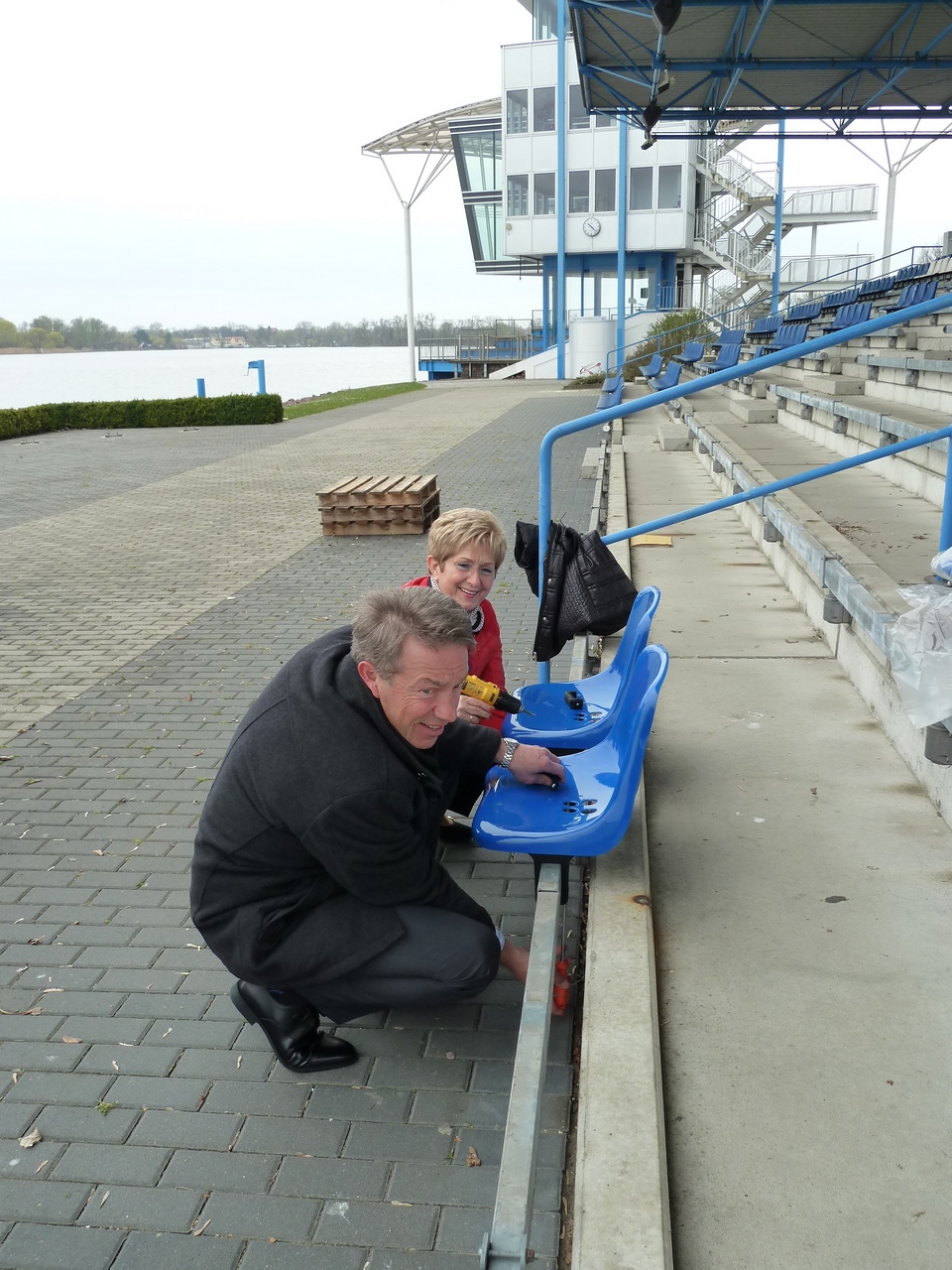 Aus den Händen von Sportminister Günter Baaske nahm Brandenburgs Oberbürgermeisterin Dr. Dietlind Tiemann am Montag, 11.04.2016, einen Zuwendungsbescheid für Fördermittel in Höhe von knapp 87.000 Euro entgegen. Das Geld – ergänzt um Mittel in gleicher Höhe aus dem kommunalen Haushalt – ist für verschiedene Bauunterhaltungsmaßnahmen an der Regattastrecke „Beetzsee“ in den Jahren 2016 und 2017 bestimmt. Ein Teil der geförderten Bauunterhaltungsmaßnahmen wird noch vor den Ruder-Europameisterschaften realisiert, die vom 06. bis 8. Mai 2016 in Brandenburg an der Havel stattfinden. Dazu zählt zum Beispiel die Erneuerung der Sitzschalen auf der Tribüne. Die ersten von rund 1.800 neuen Sitzschalen schraubten der Sportminister und die Oberbürgermeisterin nach der Übergabe des Zuwendungsbescheides persönlich an. Zu den weiteren geförderten Baumaßnahmen zählen u.a. die Installation einer Halteeinrichtung für eine seeseitige Streckenabsperrung, neue Stegbeläge für die Startanlage oder der Umbau der ehemaligen Hausmeisterwohnung zu einem modernen Medizin-Zentrum.