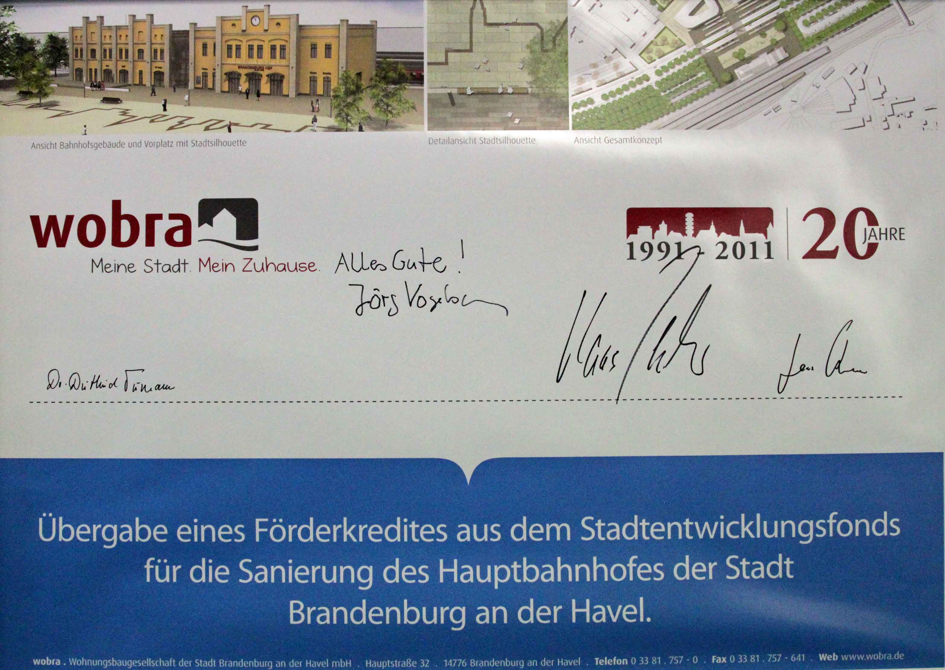 Die Übergabe des Fördermittelkredites i.H.v. 3,4 Mio. Euro erfolgte in der ehemaligen Empfangshalle des Hauptbahnhofes. Mit diesem Darlehen ist es der WOBRA möglich, das historische Bahnhofsgebäude umfangreich zu sanieren.