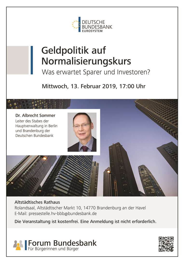 Zum Thema „Geldpolitik auf Normalisierungskurs. Was erwartet Sparer und Investoren?“ lädt die Deutsche Bundesbank interessierte Bürgerinnen und Bürger am Mittwoch, dem 13.02.2019 um 17:00 Uhr in den Rolandsaal des Altstädtischen Rathauses, Altstädtischer Markt 10, ein.