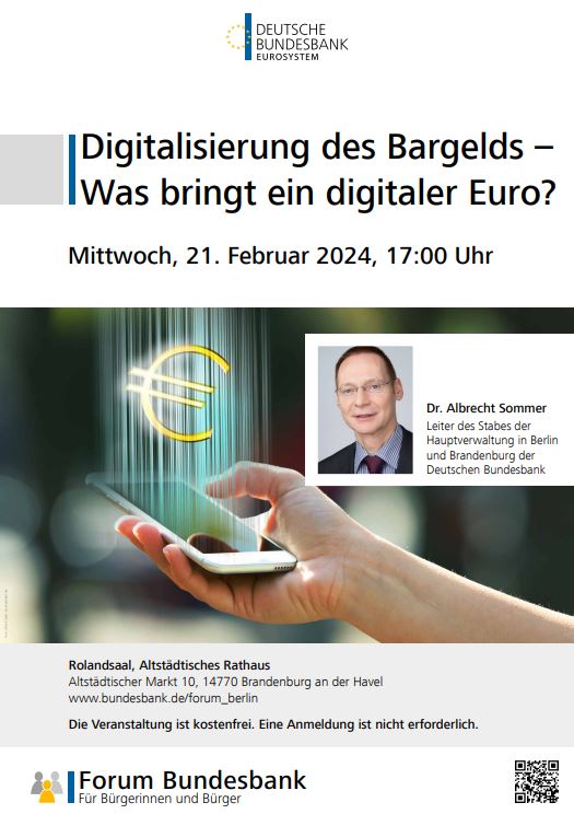 Zum Thema „Digitalisierung des Bargelds – Was bringt ein digitaler Euro?“ lädt die Deutsche Bundesbank interessierte Bürgerinnen und Bürger am Mittwoch, dem 21. Februar 2024 um 17:00 Uhr in den Rolandsaal des Altstädtischen Rathauses, Altstädtischer Markt 10, ein.