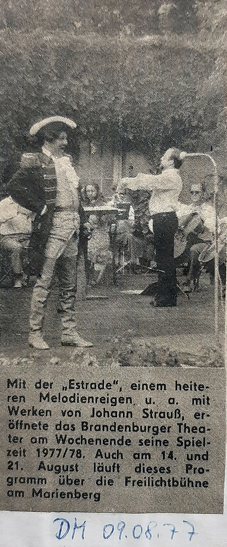 Das 65-jährige Jubiläum der Freilichtbühne Marienberg im Mai 2021 soll mit einer Ausstellung zur Geschichte der Freilichtbühne gefeiert werden. Dafür suchen wir Ihre Fotos, Zeitzeugnisse und Erinnerungen! Diese können Sie bis zum 10. März bei Frau Witt, Fachgruppenleiterin Denkmalschutz, unter katrin.witt(at)stadt-brandenburg.de einreichen.