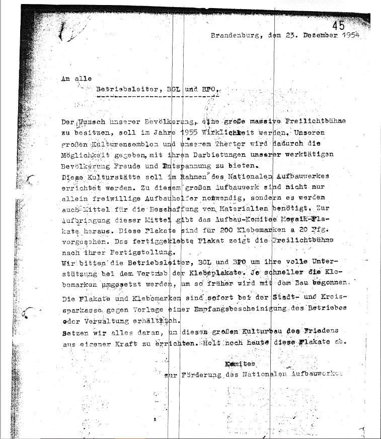 Frau Katrin Witt erreichten bereits zahlreiche Fotos, Zeitungsausschnitte und Eintrittskarten. Ein Zeugnis interessiert sie jedoch besonders: "Das Aufbau-Komitee für die Freilichtbühne hat Anfang der 50er-Jahre Mosaik-Plakate herausgegeben. Das waren Plakate mit einem Mosaik-Bild der Freilichtbühne, und diese wurden in den Betrieben ausgehangen. Dort konnten die Arbeiter für 20 Pfennig Klebemarken kaufen, die dann das Bild vervollständigten. Der Erlös wurde für den Bau der Freilichtbühne verwendet. Mich würde total interessieren, wie dieses Plakat und die dazugehörigen Marken aussahen! Leider konnte ich bisher keine Abbildungen im Archiv finden", sagt Frau Witt. Darum möchten wir Sie, liebe Bürgerinnen und Bürger fragen, ob Sie Erinnerungen an diese Plakate haben, die Sie gerne mit uns für die Ausstellung teilen möchten? Vielleicht finden Sie sogar noch eine Marke oder ein Foto der Plakate in irgendeiner Kiste oder einem Album zuhause? Wir würden uns sehr über Ihre Zusendungen freuen!