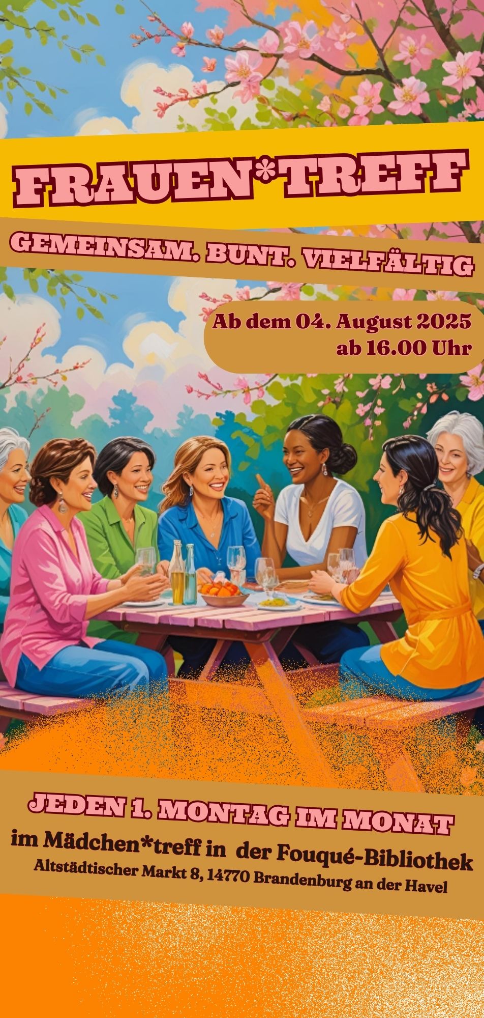 Das erste Treffen findet am Montag, den 4. August 2025, ab 16:00 Uhr, in den Räumen des Mädchen*treffs am Altstädtischen Markt 8 (im Erdgeschoss der Fouqué-Bibliothek) statt. Danach öffnet der Frauentreff regelmäßig jeden ersten Montag im Monat seine Türen.