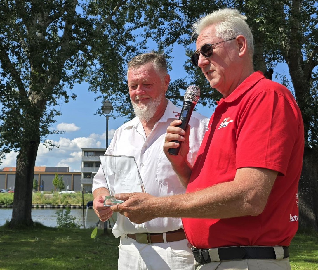 Wie im Anschluss auch Landes-Kanu-Verbands-Präsident Andreas Zimmer, überreichte Dajana Pefestorff ein gläsernes Jubiläumsandenken des Verbandes, woran sich ein kleiner Glückwunschreigen anschloss: Befreundete Wanderkanuten des BSC Süd 05 überreichten einen 100-Euro-Schein für die Nachwuchsarbeit, bevor Andrea Winkler als ehemalige Trainerin der Wasserfahrer das Mikrofon ergriff. Sie beorderte Rennsportwart Nico Bartoli nach vorn und überreichte ihm – auch im Namen ihres Gatten – einen Scheck über 3.500 Euro für die Neuanschaffung zweier Boote. Tosender Beifall!