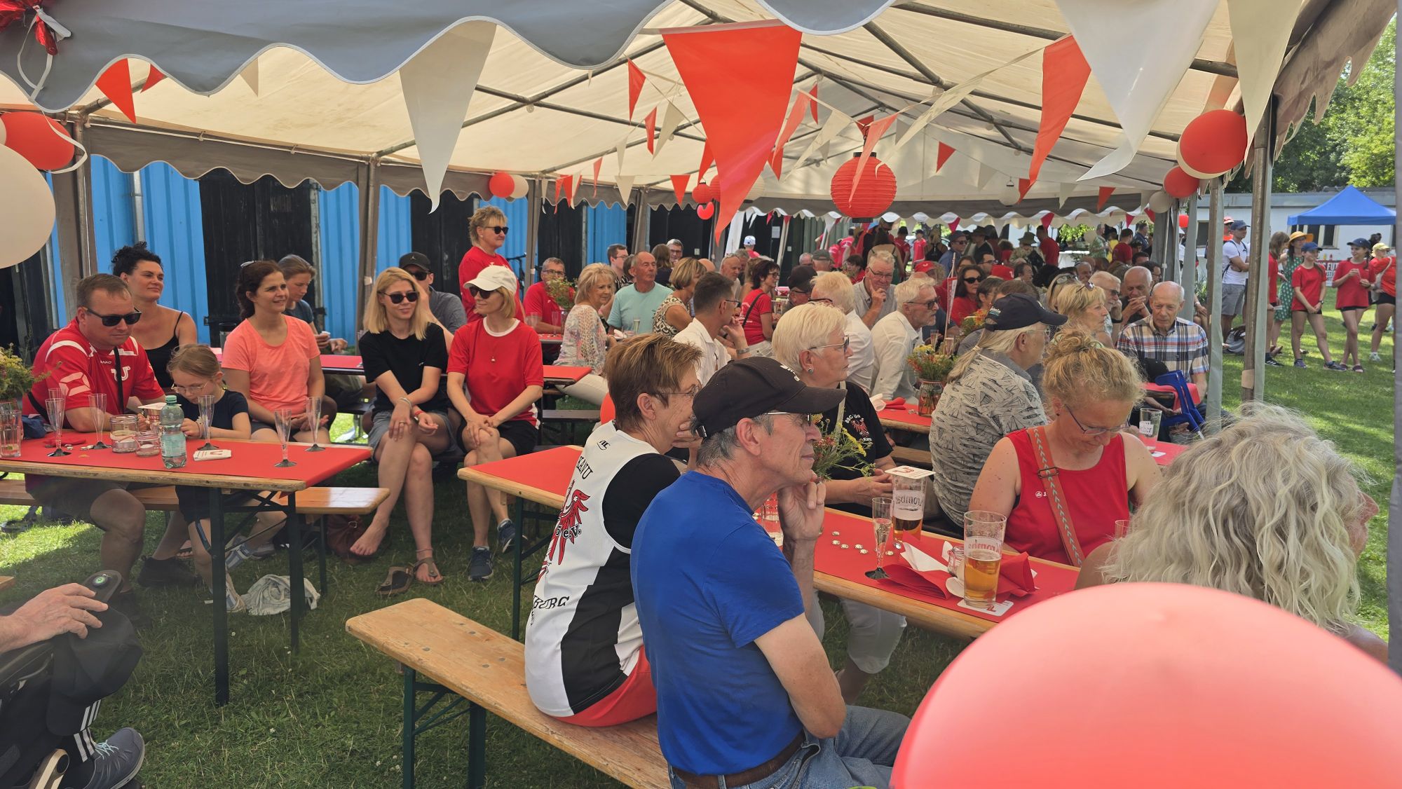 Das Ende des offiziellen Teils bedeute den Start des freien Feierns, was mit dem Plündern des reichhaltigen Kuchenbuffets begann. Sodann wurden Hüpfburg, Bällebad und Torwart belagert, die Vereinsräume besichtigt, von der Foto-Box Gebrauch gemacht und der Grillstand ins Visier genommen. Für Musik sorgten Robie Bernier und DJ Andy, für Comedy „Die süße Helga“. So wurde geschunkelt, getanzt und gelacht bis Mitternacht.