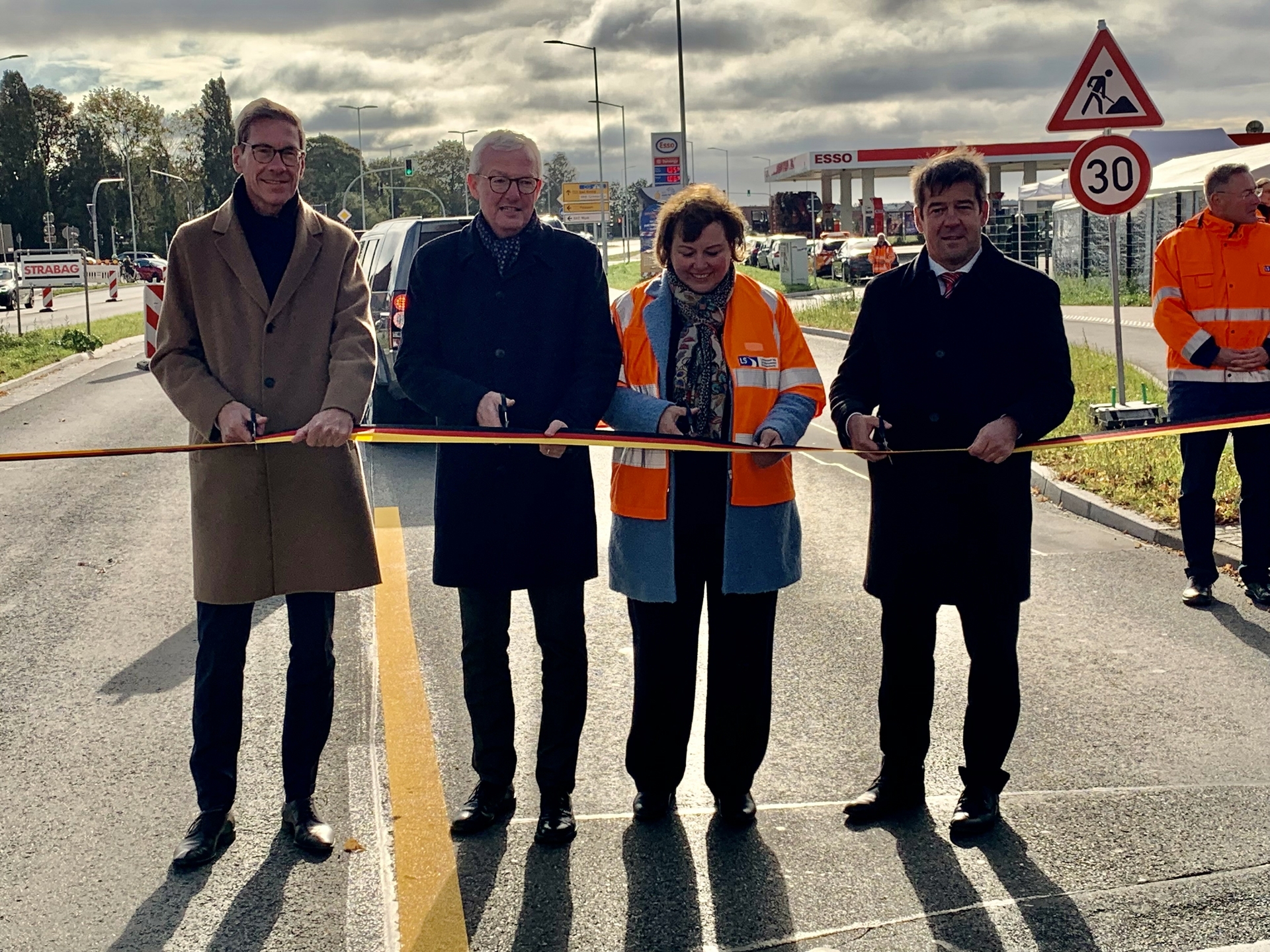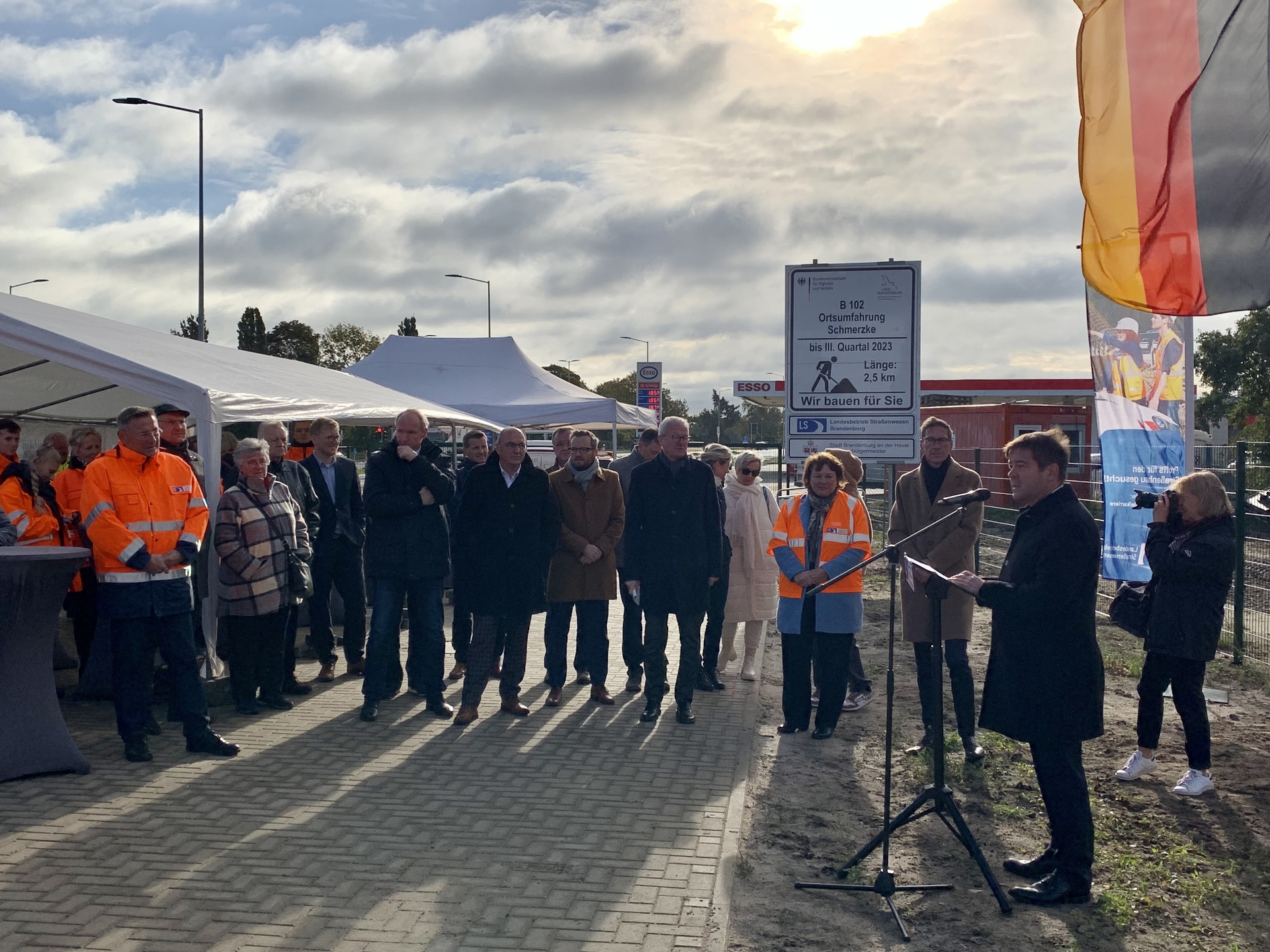 Nach gut 18 Monaten Bauzeit ist die neue Ortsumgehung Schmerzke im Zuge der Bundesstraße B 102 am Montag, 16. Oktober 2023, symbolisch für den Verkehr freigegeben worden. Der Referatsleiter im Bundesministerium für Verkehr, Frank Süsser, Brandenburgs Verkehrsminister Guido Beermann, Oberbürgermeister der Stadt Brandenburg an der Havel, Steffen Scheller und die Vorsitzende des Vorstands des Landesbetriebs, Dr. Ina Bartmann, haben das Band durchschnitten und die Strecke freigegeben.