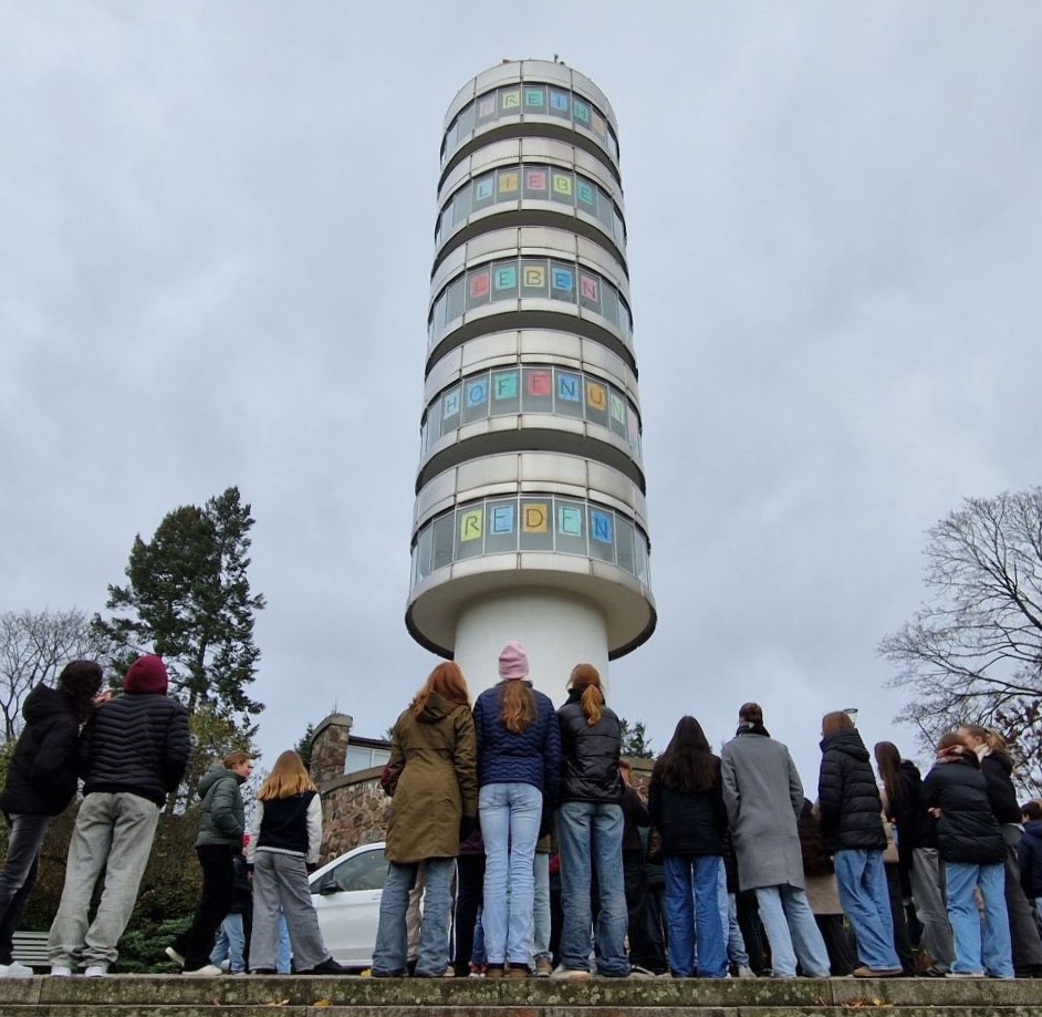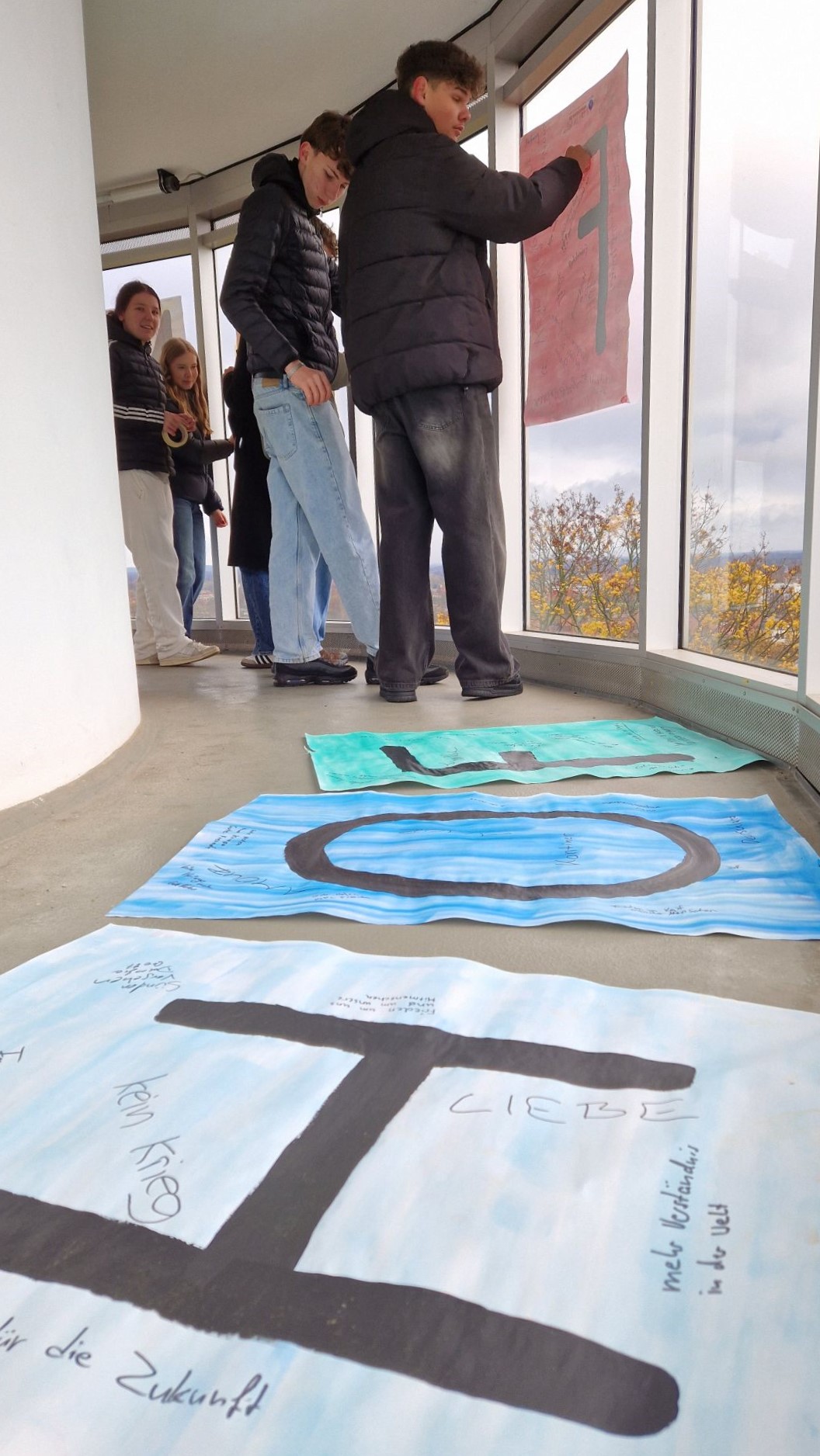 Im Rahmen der „Ökumenischen FriedensDekade 2024“ (10.-20.11.) hat Jugendpfarrerin Ulrike Mosch von der St. Gotthardt- und Christusgemeinde mit Schülerinnen und Schülern des Evangelischen Schulcampus am Dom und unterstützt vom Kulturbüro der Stadt sowie der BAS Brandenburg an der Havel Friedensbotschaften an der Friedenswarte installiert. Die Plakate mit je einem Großbuchstaben und vielen kleinen Wünschen und Gedanken waren im Rahmen des Religionskurses der zehnten Klassen entstanden und am Buß- und Bettag (20.11.) an den Fenstern der fünf Aussichtsplattform der vor 50 Jahren eingeweihten Friedenswarte angebracht worden. Unter der Überschrift „Erzähl‘ mir vom Frieden!“ waren sich zuvor folgende Fragen gestellt worden: