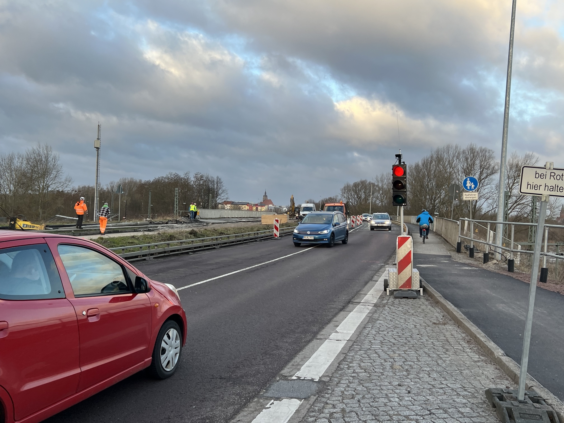 lautet die wenig frohe Botschaft für den Kraftfahrzeugverkehr. Begründend wird angeführt, dass erfahrungsgemäß ein ampelgeregelter Verkehr für alle Fahrzeuge, die sich eine einzige Fahrbahn stadtaus- und stadteinwärts teilen müssten, zu extremen Rückstaulängen in beide Richtungen führen würden. Selbst für Fußgänger und Radfahrer bleibt laut Landesbetrieb auf der Brücke kein Platz, sie können aber
