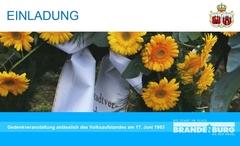 Anlässlich des Volksaufstandes am 17.06.1953 laden Generalstaatsanwalt Prof. Dr. Erardo C. Rautenberg, Oberbürgermeisterin Dr. Dietlind Tiemann und Walter Paaschen, Vorsitzender der Stadtverordnetenversammlung, alle Bürgerinnen und Bürger am Freitag, dem 17. Juni 2016 um 10:00 Uhr zu einer Gedenkveranstaltung im Innenhof der Generalstaatsanwaltschaft, Steinstraße 61 in 14776 Brandenburg an der Havel, ein.