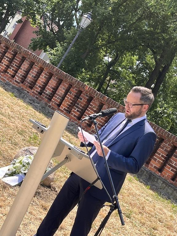 Im Anschluss richtete sich Patrick Meinhardt, Vorsitzender des FDP-Kreisverbandes Brandenburg an der Havel, mit einigen Worten zum Leben und Wirken Walther Rathenaus an die Teilnehmer der Gedenkveranstaltung.