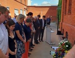 Brandenburg an der Havel legten Bürgerinnen und Bürger sowie Vertreter aus Wirtschaft, Politik und Verwaltung auf dem Innenhof der Generalstaatsanwaltschaft in Brandenburg an der Havel Kränze an der Bronzetafel für die Opfer des Stalinismus nieder.