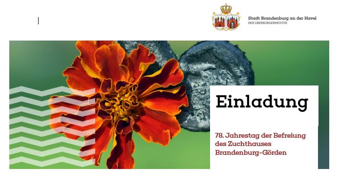 Anlässlich des 78. Jahrestages der Befreiung des Zuchthauses Brandenburg-Görden laden Oberbürgermeister Steffen Scheller und Walter Paaschen, Vorsitzender der Stadtverordnetenversammlung, alle Brandenburgerinnen und Brandenburger am Sonntag, dem 30.04.2023 um 12:30 Uhr zur traditionellen Kranzniederlegung am Ehrenmal am Marienberg, Nordaufgang, in der Willi-Sänger-Straße, ein.